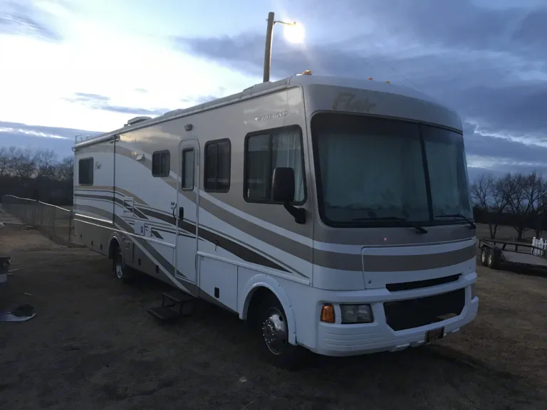 We bought this RV used and have used it for short camping trips around Oklahoma as well as a long trip to Florida! It’s setup with a queen master, a dinette that folds in to a bed, and a couch that folds out in to a bed! The master and the living room have slides. You can sleep 4-6 adults depending on height and size. There is a back-up camera. There is a flat screen tv that we added to the queen master and a tv in the front of the RV. In the living room area there are 2 driver seats, one can turn around to face the living room area. There is a couch that can seat 3 and another chair. There is an indoor shower, toilet, and sink in the bathroom area. In the kitchen there is a microwave, stove, oven, sink, and storage.