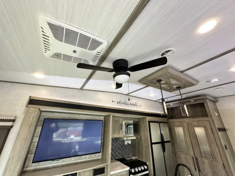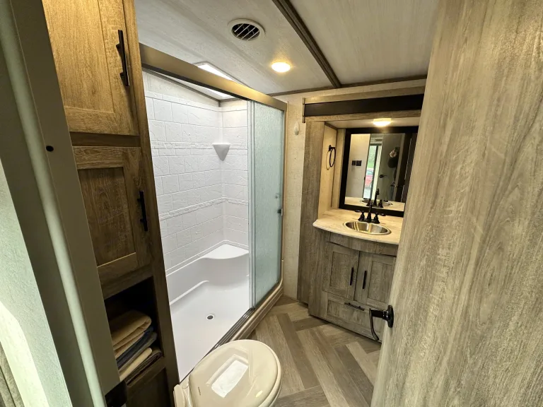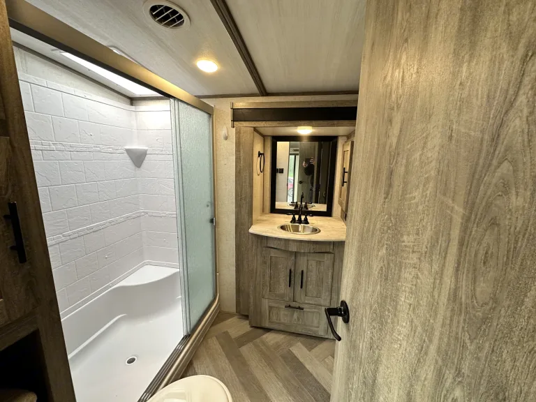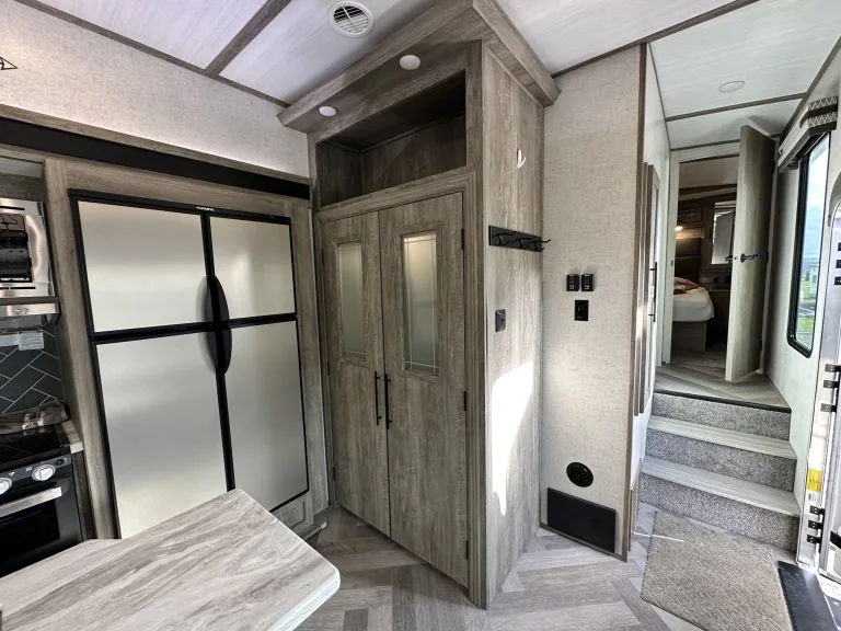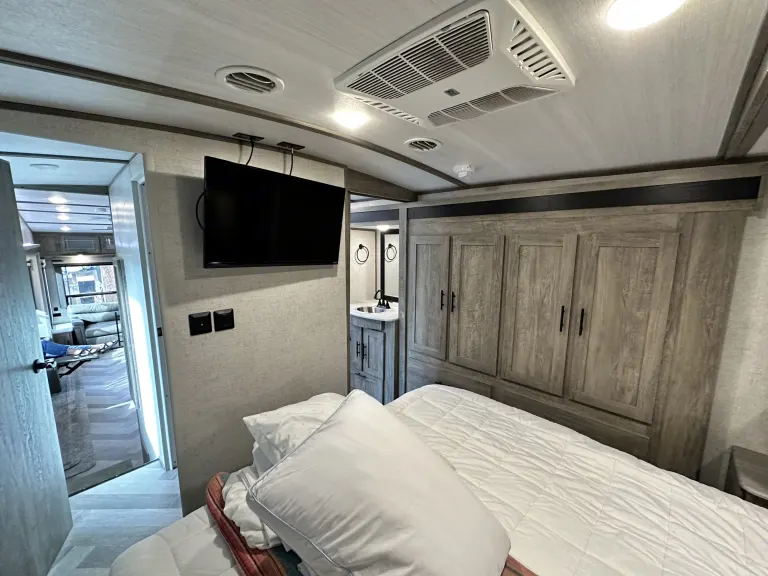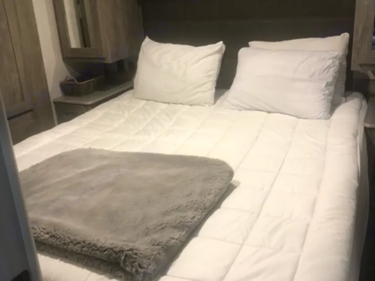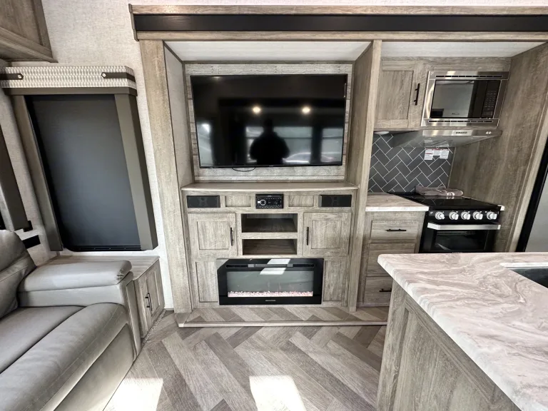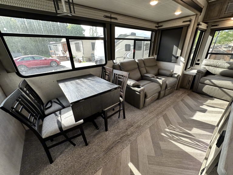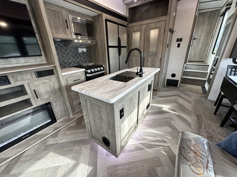 This fifth wheel is fit for a king! The front private bedroom features a custom king bed with wardrobes on either side, a slide out wardrobe, and a private entrance into the dual entry bath. Inside the bathroom you will find a residential walk-in shower with a skylight above for added natural lighting as you get ready at the vanity sink. Next to the deluxe french door pantry there is an area prepped for the optional washer and dryer to be added. The kitchen island will make your meal prep and clean up easier than ever, and the free standing dinette has a panoramic window next to it for dinner with a view. What better way to wind down your nights than to relax on the either the rear tri-fold sofa or the theatre seating while watching your favorite movie on the 50" LED TV above the 32" glass front electric fireplace!No roof access. NO Smoking OR VapingSome RV's are different in size and how many people we can sleep. What we provide in each one of our units that pretty universal is as follows.Full bedding for main bed