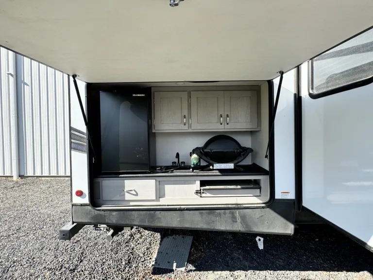You will be counting the days until your next camping trip with this triple slide out LaCrosse. Just imagine your outdoor kitchen cook center will be the talk of the campground when you are grilling steaks for your family. You can prepare the meal inside on the kitchen island with a farm sink and plenty of solid surface counter space after grabbing the seasoning from the oversized pantry. You will appreciate the two slides in the main living and kitchen area that provide everyone plenty of floor space to walk around the trailer to get to each room. If inside time is next, the hide-a-bed sofa and U-shape dinette allow everyone to come together to watch the 50" TV or play games. At night, you can retire to your own master bedroom while the kids choose a bunk bed or the Sleep and Play to try to fall asleep in their own private bunkhouse. Stop counting and head out!Wherever your camping adventures lead you, you will want a luxury LaCrosse travel trailer. Throughout each model you will find attention to detail from the solid hardwood cabinet doors, single bowl stainless steel sink, and residential J-spout kitchen faucet to the electric adjustable awning. You will find upgraded residential carpet with a pad, and in the living room there is an exclusive oversized MAX slide out offering nearly 40 cu. ft. of additional living space. MAX protection is found in the exclusive Eternabond construction which includes an enclosed and heated underbelly plus enclosed heated holding tanks and more. The mandatory Advantage Package includes the following - Universal Docking Center, electric tongue jack, frameless windows, a Furrion residential cooktop, solid surface countertops, a large stainless steel refrigerator, and so much more!Some RV's are different in size and how many people we can sleep. What we provide in each one of our units that pretty universal is as follows.Full bedding for main bed