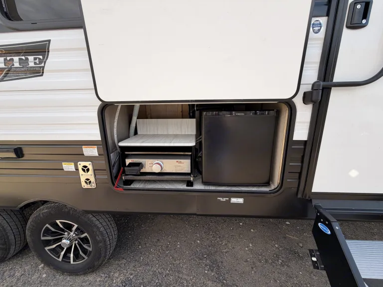Step inside to discover modern conveniences and home-style comforts: a full kitchen with a three-burner cooktop, large refrigerator, residential-style countertops, and a U-shaped dinette that doubles as extra sleeping space. The bathroom is easily accessible, and outside you’ll find features like pass-through storage and an optional camp kitchen for outdoor cooking.