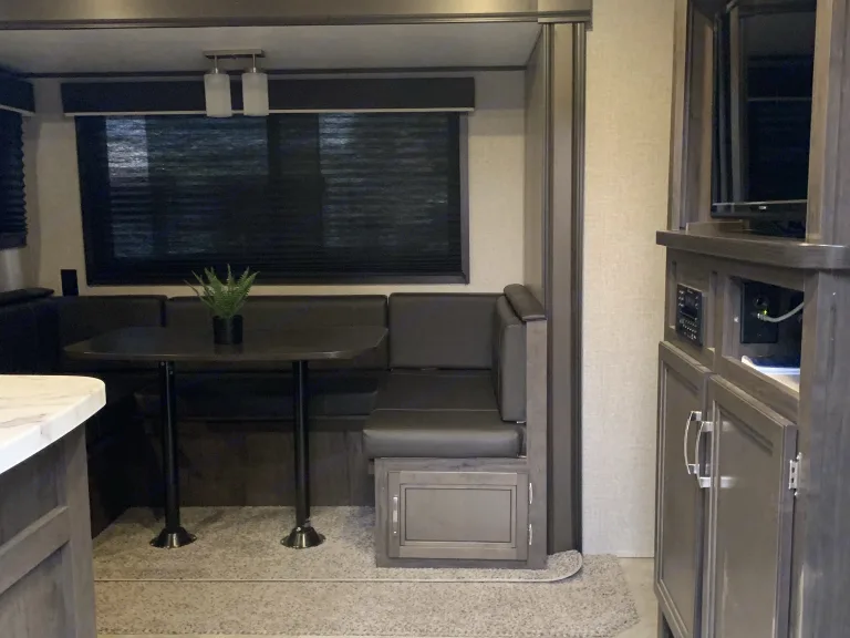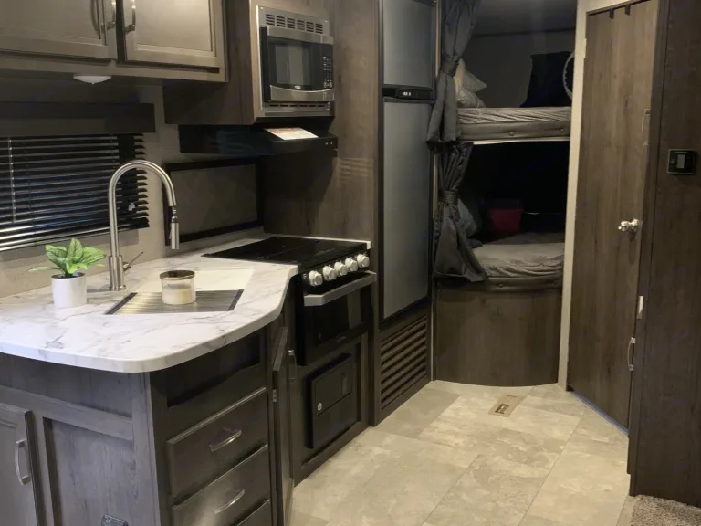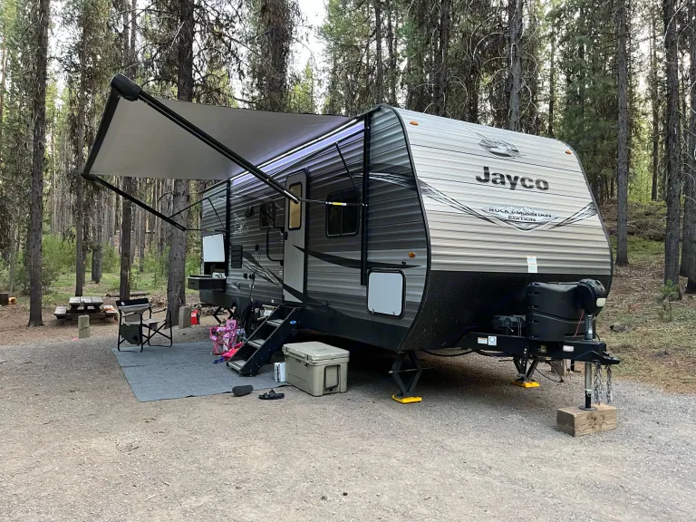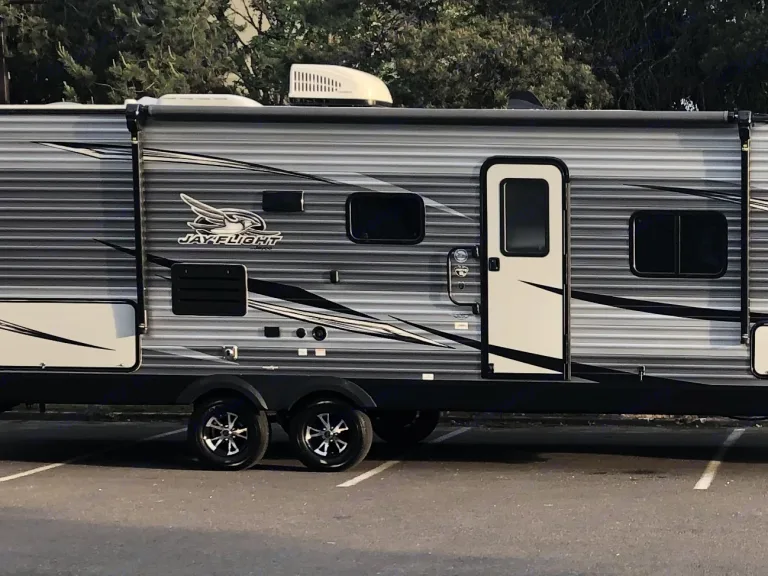Our pet friendly, family friendly 2020 Jayco Jayflight is perfect for weekend getaways and family vacations! What's includedIt comes with modern laminate flooring, solid surface countertops, and a neutral color scheme to brighten the space. The trailer is 29’ long and has a single slide out. There is a queen bed, two twin bunks, and a convertible dinette with seating for 4 for sleeping spaces. Our kitchen has a refrigerator, microwave, sink, and three burner stove along with a convenient pantry space. The bathroom includes a toilet and large shower with vents and a skylight. There are LED lights throughout the inside of the camper as well as Bluetooth or radio speakers and plenty of windows for natural light. Also, the camper includes a fully functioning air conditioning unit as well as a propane furnace for colder nights.Outside, there is a 16' automatic extending awning for the perfect entertaining space. The awning includes LED lights and Bluetooth or radio speakers. There is also an outdoor storage compartment for extra space. One of my favorite features is the outdoor kitchen! Two burner stove, sink and a mini fridge so you can cook and entertain while hanging out with everyone outside!The trailer is approximately 6000 lbs dry weight for easy towing. The weight distribution hauling setup will be included at no extra charge. This trailer uses a 7 pin connector for lights and brakes.