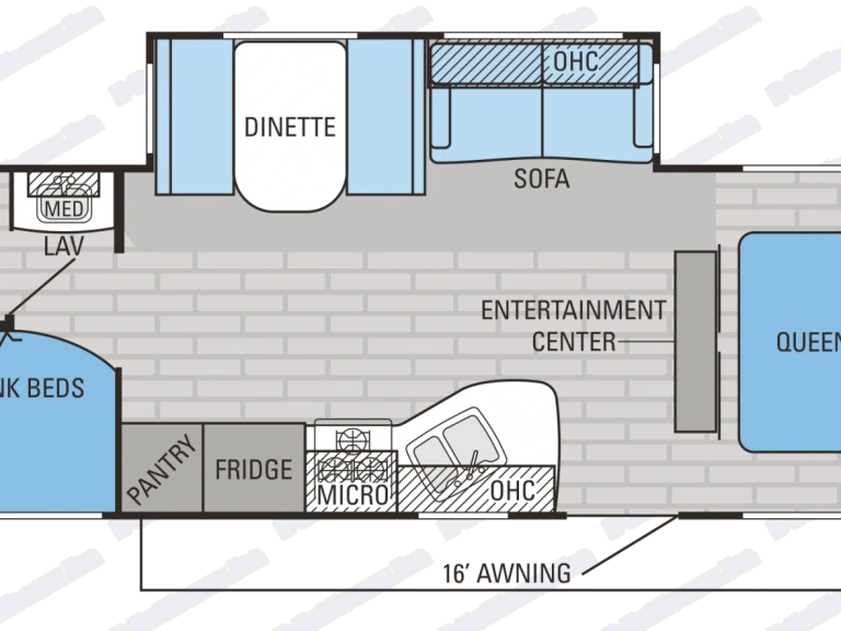 AwningVery clean 30' (tip to tail) foot travel trailer with living/dining room slide out, private master w/queen bed, 2 full bunks plus dining table that converts into a bed. Full Kitchen. Very nice trailer for a family or a group of adults.