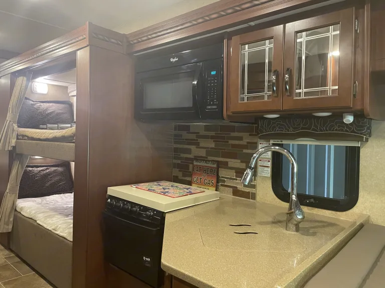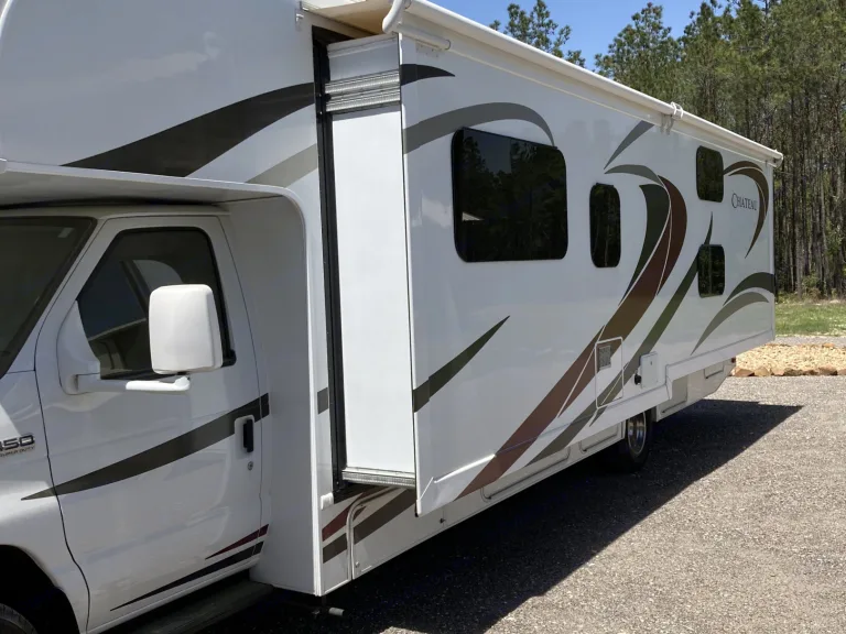 Thor Chateau is loaded with everything you need for your fun family road trip! There is one slide out, bunk beds and enough space to sleep 10 people comfortably. There is a lot of storage space in and out. In the evening you are protected by the elements of the weather below the motorized awning extension. This unit is privately owned, well maintained and cleaned thoroughly after every rental. My husband and I tried to think of everything needed when camping so below is a list of all the amenities that are supplied with the unit.Thor Chateau Manual