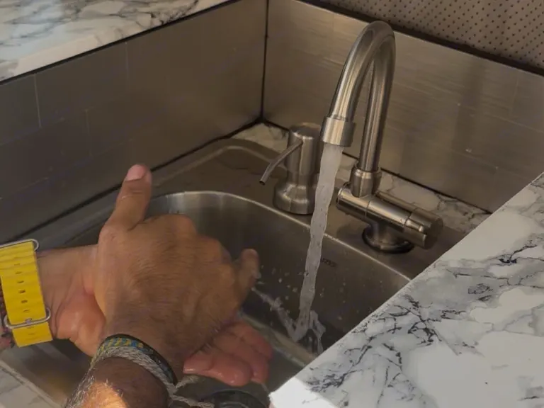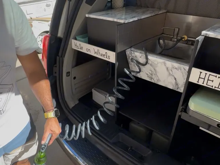 • Sink with electric water pump + extendable shower hose (perfect for dishes, handwashing, or quick rinses).