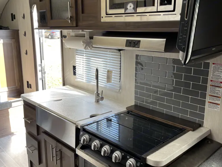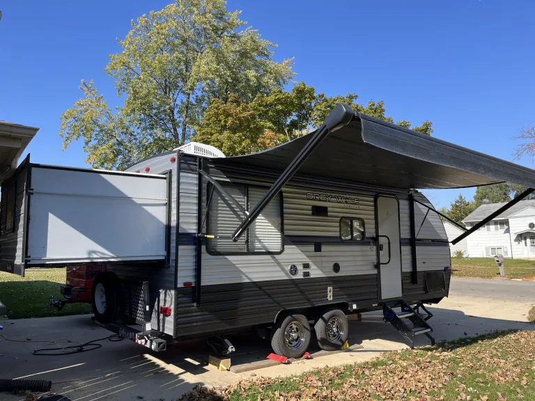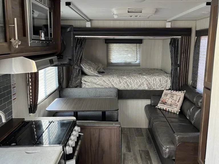 This modern 2019 Forrest River Cherokee Grey Wolf Camper 19SM is equipped with everything you need to plan the perfect family getaway! The spacious design of this trailer is perfect for those who want to hit the open road and explore the great outdoors! If you're like us, you love to go on adventures, but crave the comforts of home.There is a rear queen size slider and double bunks in the front - with a queen below and single above. The trailer includes central air conditioning, heat, bathroom, stove, microwave, oven, large fridge, and pantry. One of our favorite parts about this trailer is the compact size. It makes travel and set up easy!Unlike most trailers, our dinette area and sofa are directly across from each other which make hanging out inside feel more like a living room!Roll out the awning and create your own audio visual experience with the outdoor A/V hookup and LED lighting.We know you will enjoy it as much as we do!What's includedLinens, utensils, cookware, 8pc table setting, 4 camp chairs, Blackstone griddle and TV upon requestDelivery and pick up availableRecommendationsWe love KOA campgrounds! There’s always something fun for the kids to do. Other things to noteWill consider Tailgating and Festival events on a case by case basis.
