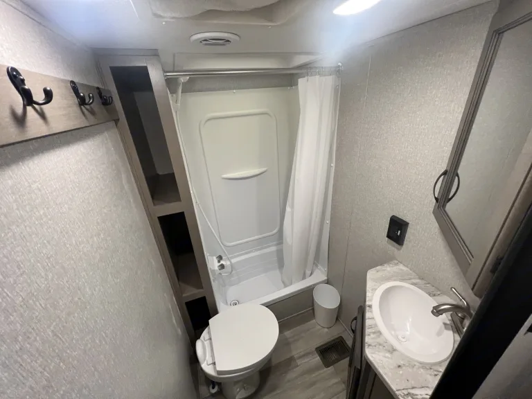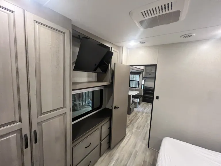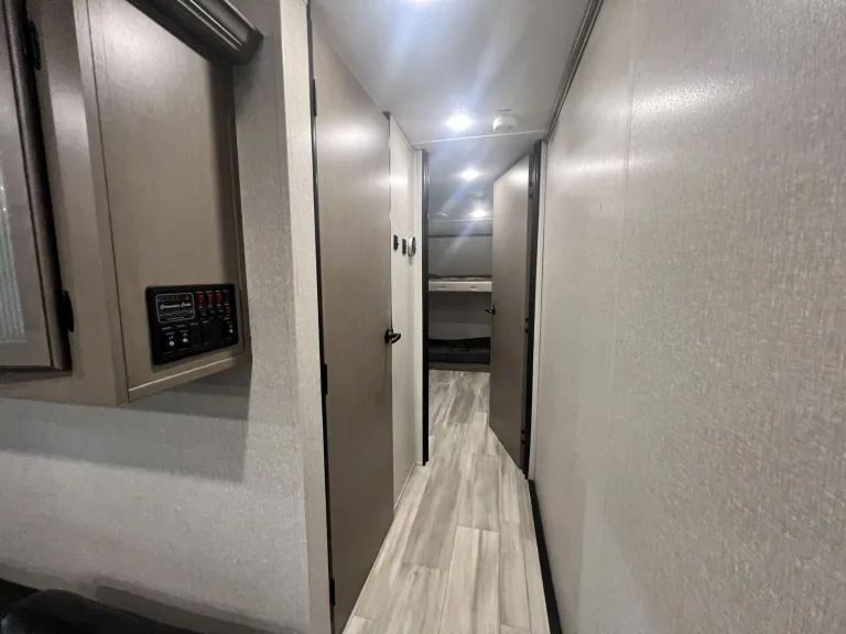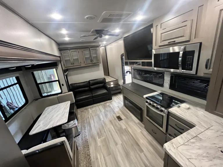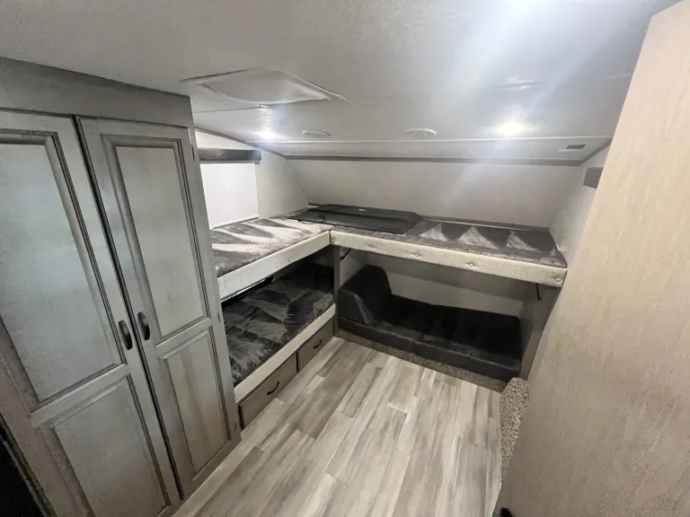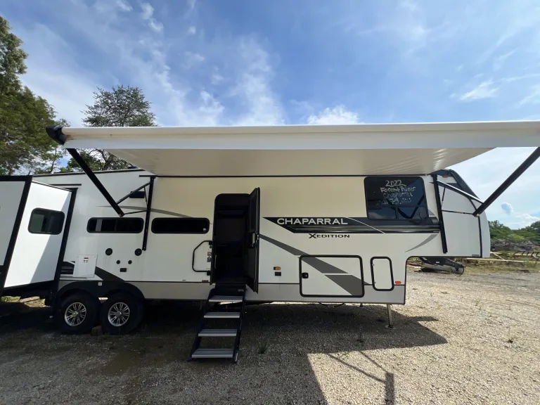 Experience comfort, convenience, and space like never before in our 2022 Coachmen Chaparral 355FBX! Perfect for families, friends, or extended stays, this luxury fifth wheel is packed with features to make your RV getaway smooth and enjoyable.This rig sleeps up to 11 guests comfortably with:A private master suite featuring a queen (or optional king) bedA bunkhouse up front with triple bunks and a hide-a-bed sofaA tri-fold sofa in the living roomA U-shaped dinette that converts to a full-size bedYou’ll love the two full bathrooms, one connected to the master and another near the bunkhouse — ideal for large families or guests. The fully-equipped kitchen includes a large 17 cu ft refrigerator, microwave, oven, and 3-burner stove. Relax in the living room with a 50” LED TV and plush seating, or unwind outside under the 20 ft electric awning with LED lights.Additional amenities include:Washer/Dryer prepOutdoor kitchen hookupsAuto-leveling systemAmple storage inside and outWhether you’re booking a weekend at the lake or planning a cross-country journey, this RV delivers luxury living and plenty of room to stretch out. Book today and make your next adventure one to remember!