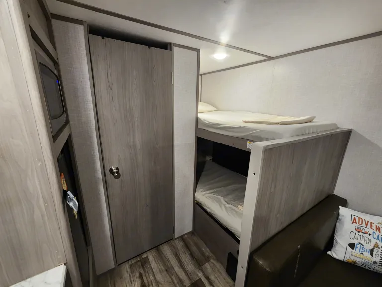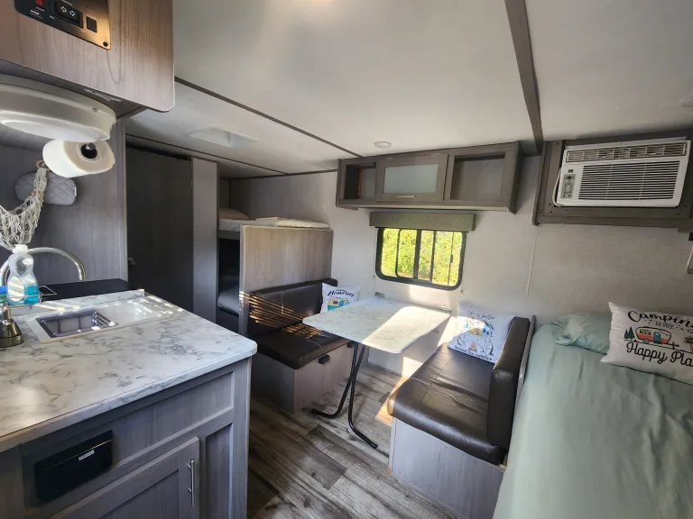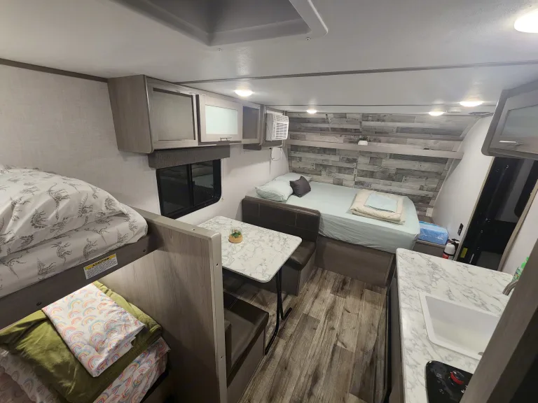 Take OUR LittleGuyRV ON NEW Adventures! Great for first time campers and small families too!We are a family of 5 who loves to go on road trips. We have recently added an RV to our family and we would love to share it with you all so you can make new memories as well. Don't forget your fur babies! We are pet friendly :)The Coleman Lantern LT 17B is a brand new light weight 17 ft. single axle bunkhouse trailer! With the trailer it makes it 21ft. This travel trailer comes equipped with a single 20 pound propane tank at the front of the trailer. It has a small 2 burner stove top, microwave and fridge.Stocked with clean bedsheets, pillows, trash can, eating and cooking utensils, toilet paper, paper towel and paper plates. Don't forget to bring your own towels! :)It has a beautiful fireplace that can help keep you warm during the winter.If you're worried about storage, worry no more! As this trailer provides numerous space to store your belongings. You can find storage under the queen mattress, under both benches and under the bottom bunk (Outside storage has RV tools etc. so that space is limited).We do not have a generator so if you are planning to camp somewhere without traditional electrical hookups (boon-docking or dry-camping), please take this into consideration. The battery only works for the lights and awning.Delivery fee includes drop off, pick up and set up.