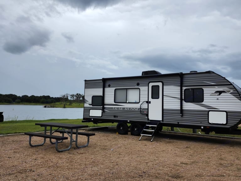 The whole family will love camping in this warm and cozy travel trailer in like new condition! It has everything you need from a set of double bunk beds to a 14' power awning with LED light strip and outside shower. The front queen bed has under-bed storage to keep extra blankets or suitcases out of the way. After getting a good night's rest, head to the rear corner bathroom to freshen up in the ABS tub/shower surround with skylight above and then fry some eggs up on the three burner cooktop. You can enjoy your meals at the booth dinette or take advantage of the pull out sofa to take an afternoon nap!What's includedRV is fully equipped with dishes, utensils, pots/pans, clean; linens, blankets, towels and a coffee pot. Also comes with 2ea 24in smart TV'sRecommendationsTravel Spots Recommended by host are;Double Lake Campground, Coldspring, Texas