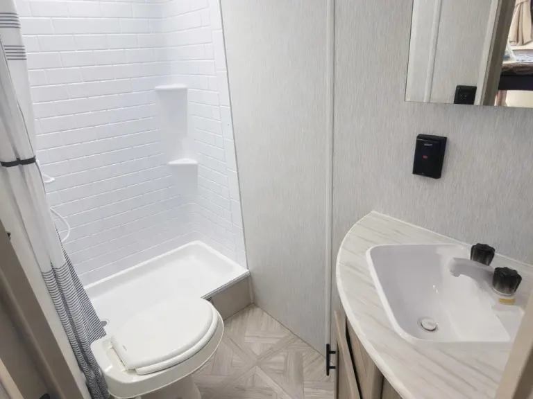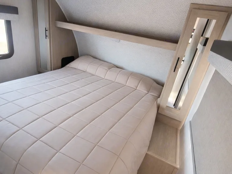 Cozy RV rental bedroom with a comfortable quilted bed, built-in storage, and mirror. Ideal for compact travel.. Forest River Salem Cruise Lite 2023