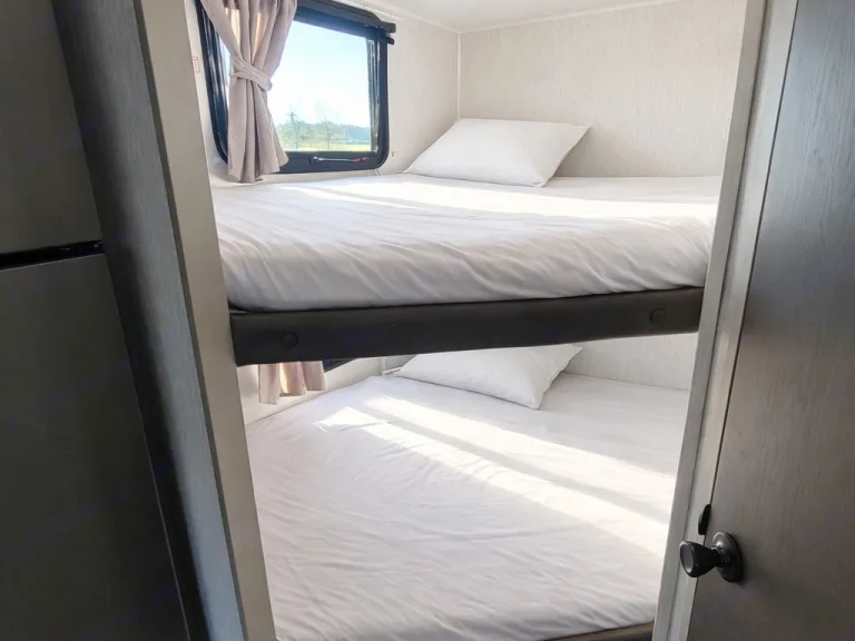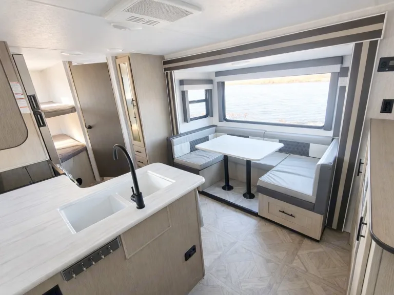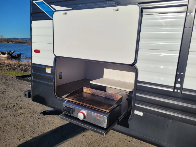There are plenty of comfortable sleeping spaces between the rear corner double bunk beds and the queen bed inside the front private bedroom. The bedroom also has wardrobes and nightstands on either side of the bed too. When you're not using the U-shaped dinette slide to enjoy a meal or play a game, you can transform it into an extra sleeping space. The rear corner bathroom has a 40" tub/shower for you to rinse all the sand out of your hair from your beach day. On a warm sunny morning you can enjoy making breakfast outdoors on the outdoor kitchen cook top!***Let us safely bring the trailer to your next adventure! This trailer is delivery and set up only. Sorry, no customer towing.***What's included• Pots and Pans