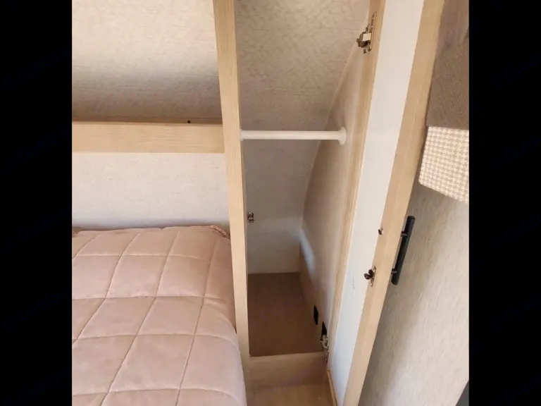 RV rental sleeping area: bed & open wardrobe with hanging bar. Functional storage for travel clothes.. Forest River Salem Cruise Lite 2023