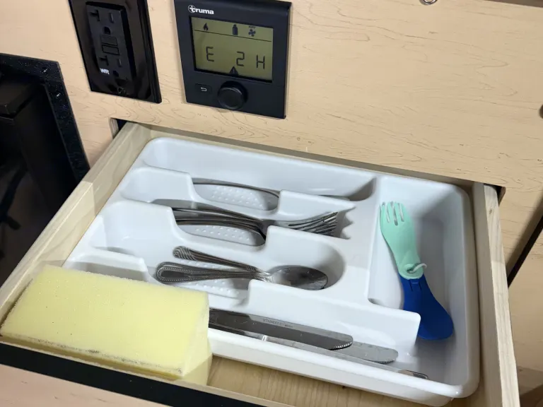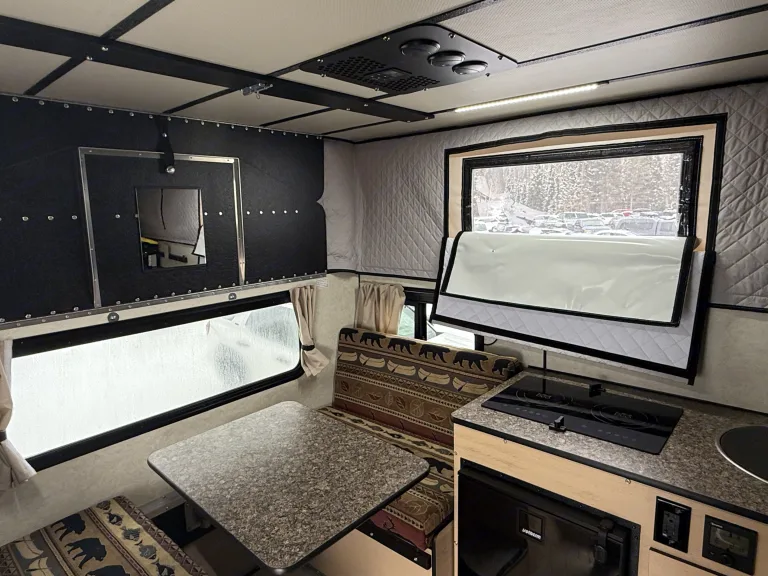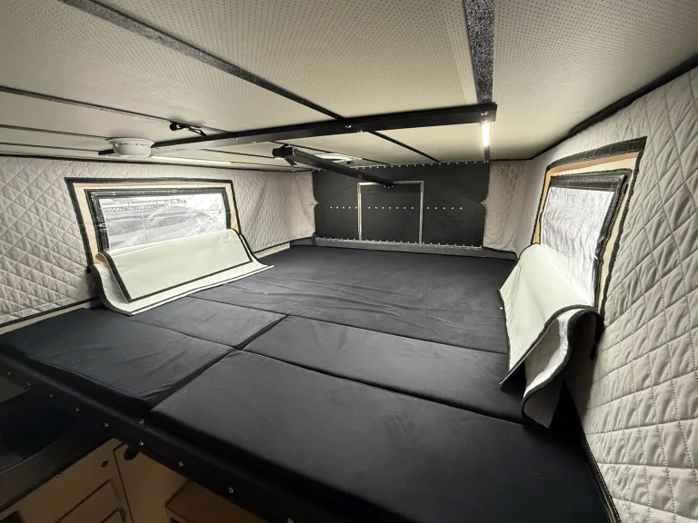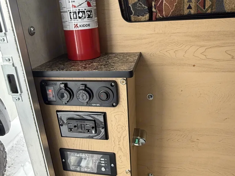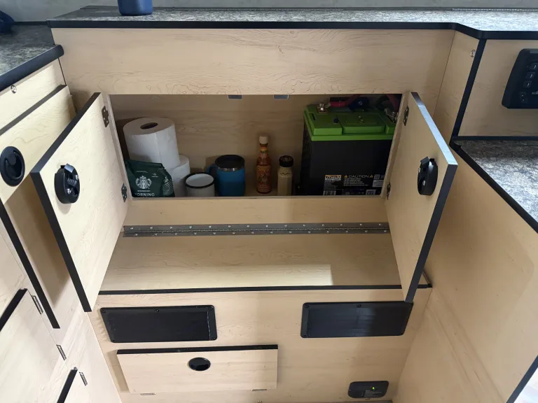 • Lithium battery bank powers lights, fridge, Starlink (add-on), and electronics