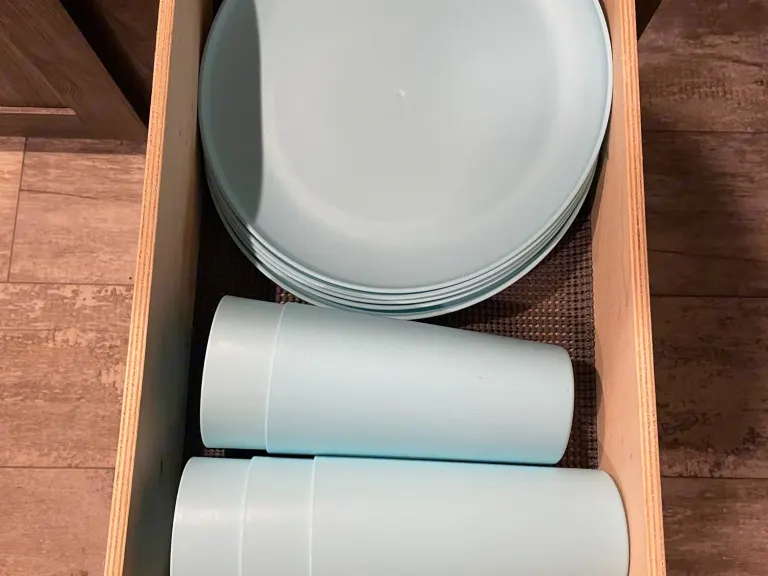 kitchen essentials (pots, pans, plates, cups, eating utensils, cooking utensils, dish soap, sponge, cutting board, strainer)
