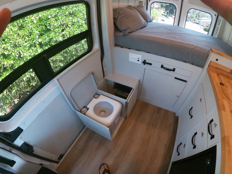 5 Gallon waste tank with a 2.5 gallon fresh water tank. Hand flushing pump. Fits perfectly inside the bench in a Van. You keep the toilet at the end of your trip for future Van trips or camping adventures.