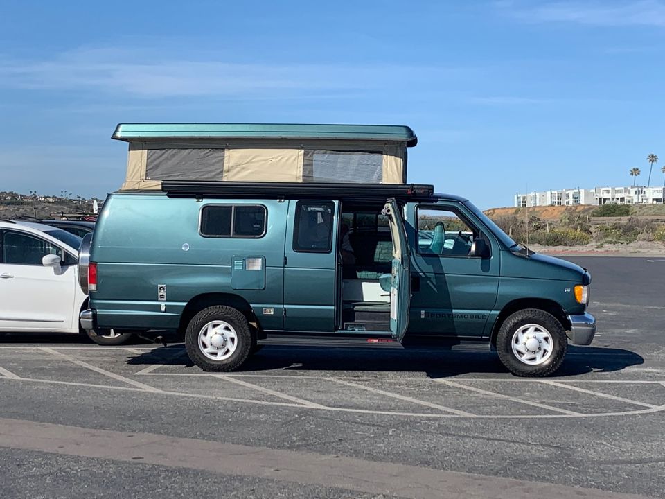 It's a 1997 but looks and feels at least 10 years newer. Well taken care of. Has everything you need for a great trip. Pop top, huge awning, fold down couch, swivel front seats, stove, generator, shore power and city water connections... Goes on and on! Portable toilet that hides away in bottom cabinet. Pop up tent included to use for the toilet/shower outdoor.What's includedUtensils, cookware, plates, camping table, camp chairs, outdoor stove. Lantern and some outdoor lights. Other camping supplies can be included, some no charge, other for a fee. Please inquire. We don't usually include bedding but can throw in some sleeping bags, pillows, and blankets for a small fee. RecommendationsBeach campsites around Southern CA are the best. We've taken it to Yosemite and Tahoe, but would prefer it be used more locally. Other things to noteNo smoking. No festivals. Small dogs allowed.