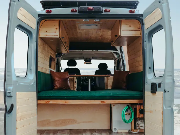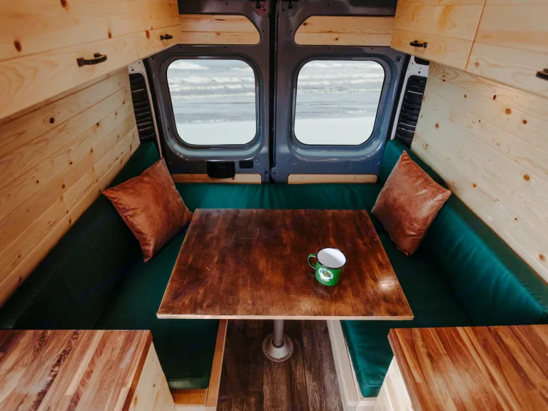 What a stunner, right? This custom camper will cause a scene in the very best of ways. The beautifully converted Hydeout has everything you need for a comfortable and relaxing camping getaway. It's all cozy cabin camper van vibes with Hydeout.Beyond the aesthetic charm (which is seriously, so so charming), Hydeout boasts everything you need to be comfortably contained, and with plenty of room to stretch and stand. Powered by two 100 W solar panels and two 12V 100 AH batteries, you'll have energy for your adventures.This spacious camper van also has lots of counter space, a sizable sink with a rotating faucet, Rtic cooler, swiveling driver seat, and an ample dining area that converts to a bed (54 in wide x 68 in long). If you wanna catch some Vitamin D, you can head on up to the sun deck and relax with a nice book (and an awesome 360 degree view!).Location: This van is located in Fairfax, CA about 35 miles northeast (or 50 minutes) of San Francisco International Airport (SFO).Mileage: 120 miles per day are included with your rental. This van charges $0.50 cents per mile beyond this limit.Please note the following!The sleeping area dimensions are 54 inches width x 68 inches length. (Not for people taller than 5'7")This van has a 4 night minimum.Our camper vans are not Burning Man friendly.