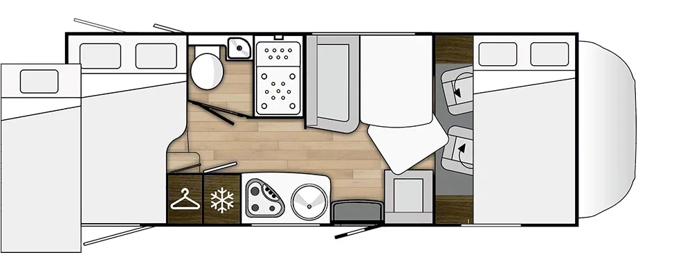 • 5 Plazas para dormir, con 1 camas de matrimonio encima de la cabina, y otra cama doble en la parte trasera, con posibilidad de bajar una litera del techo en caso de ser 5.