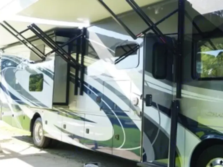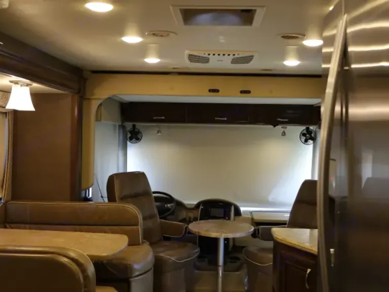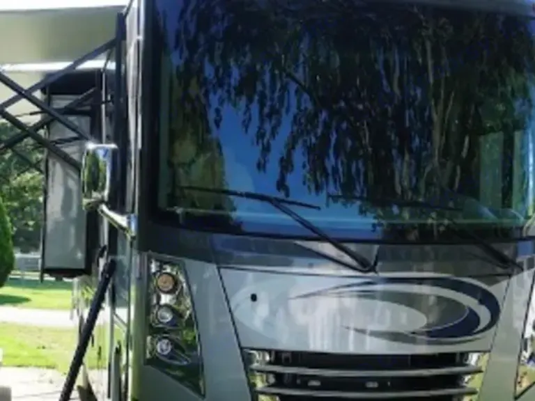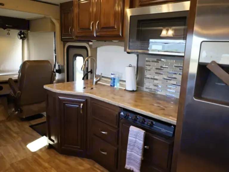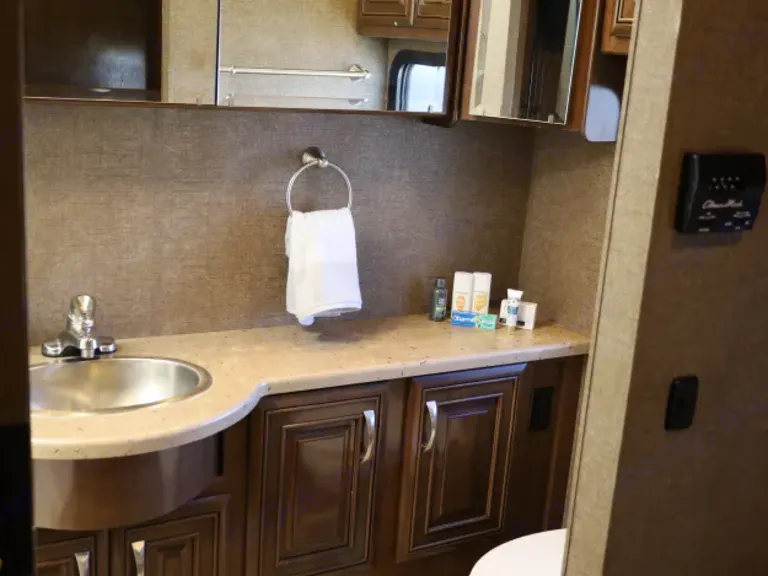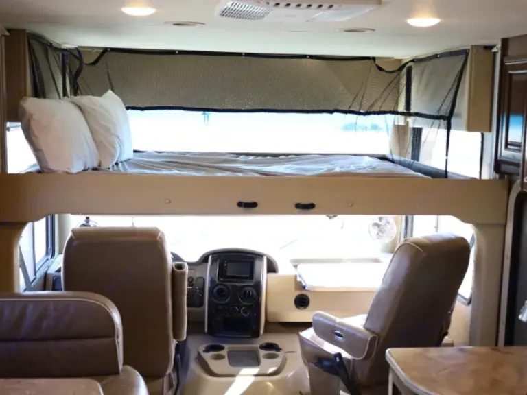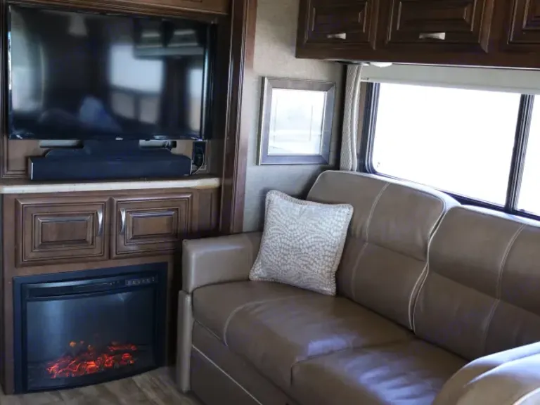 Relax on your next adventure with this beautiful Class A motorhome that sleeps up to 10 people and has seatbelts for 7 people. The motorhome has a leather interior, 5 TVs,, a fireplace, a bunkbed that fits two adults, two separate bathrooms, two solar panels, and four lithium batteries, a generator attached to the coach, and more.When it comes to sleeping, the coach includes a master king bed, bunkbeds, a jack knife couch that pulls out to sleep two, the kitchen table that folds down to sleep two, and a bunk bed over the driver seat sleeps two adults (or three children).Other amenities include a residential-size refrigerator and freezer with an ice maker. It also includes a DVD player, Dish Network Satellite TV, Bluetooth radio, an outdoor TV, a stovetop with three burners, and a microwave convection oven.We provide clean linens, pillows, and towels. All you need to do is bring your food, cups, and plates.Most importantly, it is easier than towing a big RV, but it gives you all the comforts of a larger RV. It has a backup camera, side view cameras to help you know if someone is in your blind spot, cruise control, and a Garmin turn-by-turn direction GPS that mounts separately on the dash.However, this RV is NOT approved for camping on dirt. You must camp on the pavement at a campsite, rest stop, or on gravel.