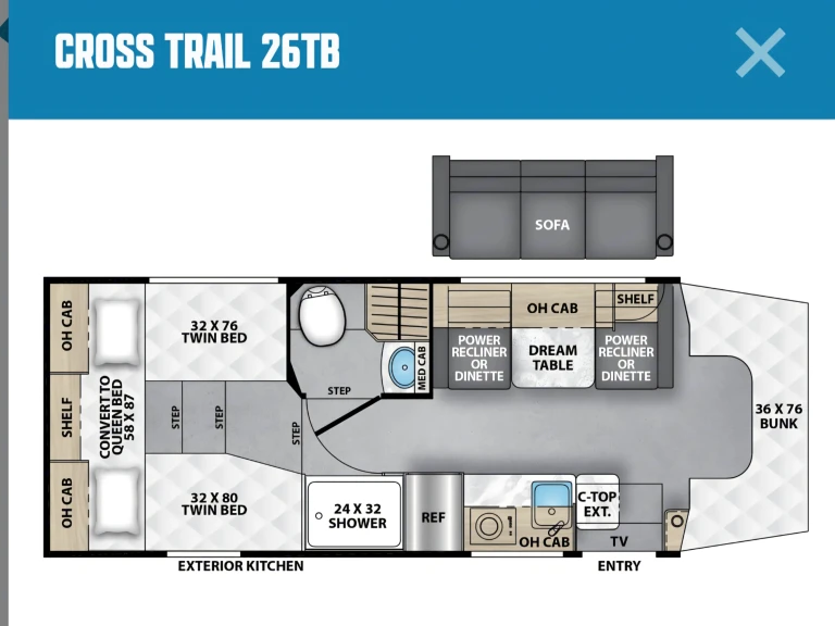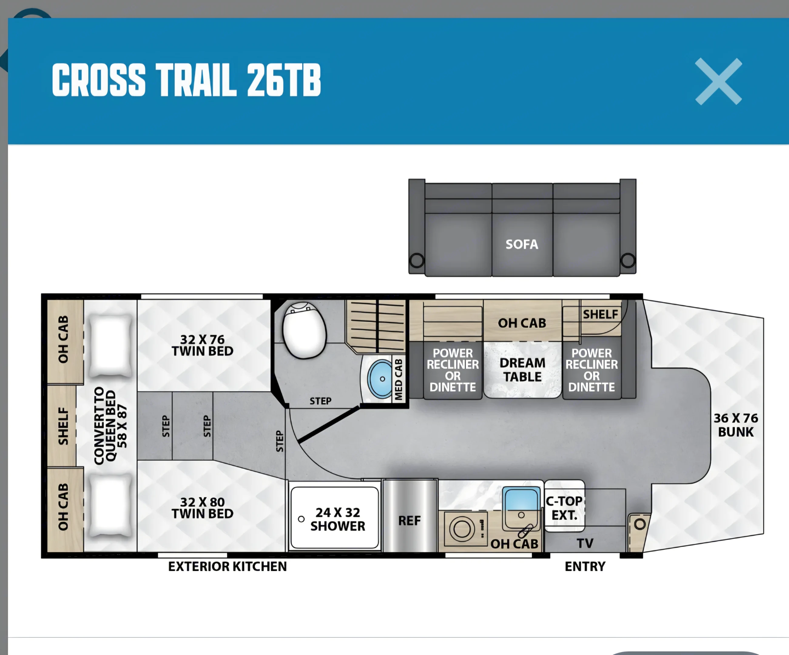 This RV is a cozy home on wheels, with everything you need to feel at home—wherever the road takes you!Full OFF Grid Capabilities DON'T Stay IN A State Park/Campground IF YOU Choose NOT TO . 3600Watt Inverter RUN Everything OFF OF THE Lithium Batteries, NO Need TO Connect TO Power.2ND Kitchen Which IS Located ON THE Exterior OF THE RV . FOR Outdoor Entertainment---Key FeaturesSleeps up to 5 Guest comfortably2 twin-size beds or a can be set up as a King bedFull bathroom with Stand alone shower. Sink, and toiletFully equipped kitchen: microwave, induction cooktop, refrigerator, and sinkHeating and air conditioning systemModern screen with streaming capabilitiesAutomatic retractable awning for outdoor shadeBuilt-in generator200W solar panel with 400 amp hours of lithium batteries for off-grid camping. With a 3600 watt inverter for complete unsupported boondock camping.---Extras You'll LoveKitchen kit (pots, plates, and utensils)Food storage containersClean and cozy beddingHand and bathing towels2 outdoor folding chairsPersonal Hygiene items ( soap, toilet paper, shampoo, towels, ect.)Cleaning supplies: Basic products and utensils (paper towels, disinfectant, sponges, ect.)Easy to Drive + Roadside AssistanceThis RV is perfect for both first-time and experienced drivers. We keep it clean, maintained, and road-ready.