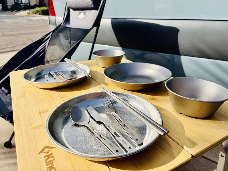 2. Pure titanium tableware (2 sets) : Lightweight, clean, and easy to handle, including knife, fork, plate, and small bowl. Titanium naturally resists bacterial growth and does not react with food, making it hygienic and safe.