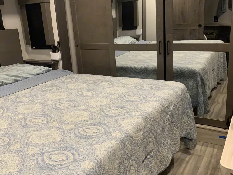 You find the space, we deliver this rig to you (NOT Allowed IN ALL Parks). Bring the in-laws, the cousins and the neighbors...or the entire soccer team! You will have endless nights of fun in the living area that has two sofas, a fireplace, and a Smart TV, and since the kitchen is also included in this space, you can get up to make a little snack while still being involved in the party. Get away for a little relaxation in the front master suite. The bedroom has a king-size bed slide for some extra space and comfort, and the full-width wardrobe will easily be able to store your clothing. The other area that is decked out to perfection is the 13' separate garage. The garage has two roll-over sofas, a queen-size bunk, a half bathroom, and the second exterior entry door, and just outside of that entry door is where you will find an air compressor on the exterior. There is plenty of room for all to enjoy the deck off the back (when space allows). What's includedServices available: Everything you would expect in a hotel, on wheels. Kitchen is fully stocked with all items expected in a private rental. Foldable Camping Chairs included upon request.