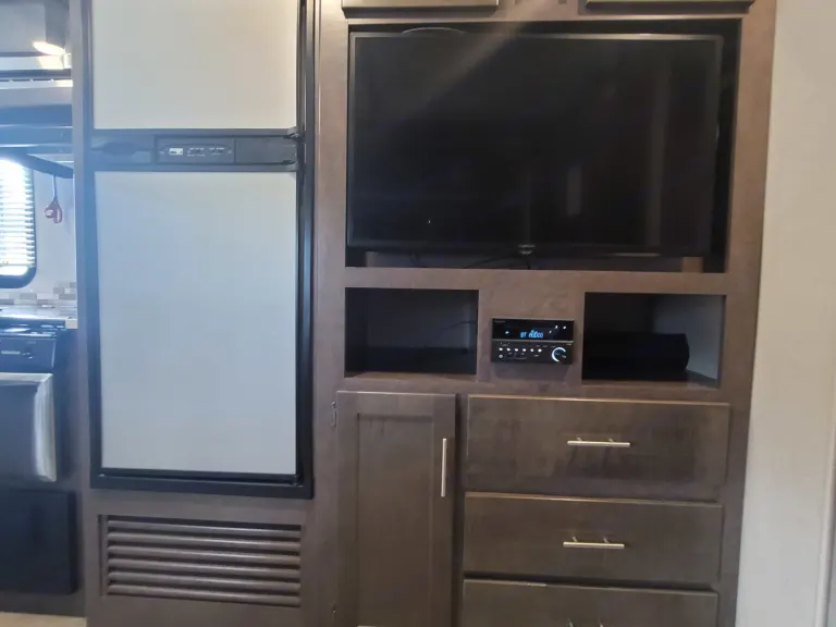 This is our 30-ft. bunk house travel trailer - the perfect home-away-from-home for the whole family. The trailer has a queen size bed in the bedroom out front, two full size bunks in the back and then the dinette and sofa fold out to full size beds. A single slide-out provides ample room in the main living area and kitchen. The dinette seats our family of 5 comfortably with the three kids on one side and two adults on the other, but can also fit 5 adults with a chair sat at the end of the table. The built-in entertainment system has a large flat-screen TV and the DVD/CD player is connected to indoor and outdoor speakers. The kitchen is well appointed with a propane range, dual basin sink, refrigerator and freezer, microwave, and plenty of storage.