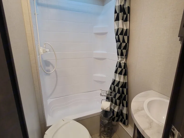 The bathroom has a bathtub/shower combo which is great for bathing little ones, but also large enough for an adult to comfortably shower.