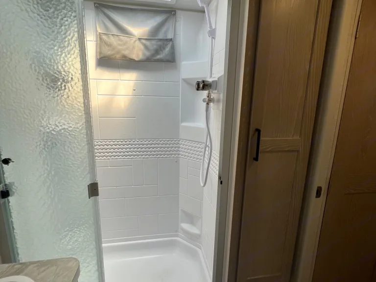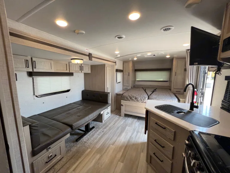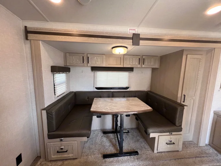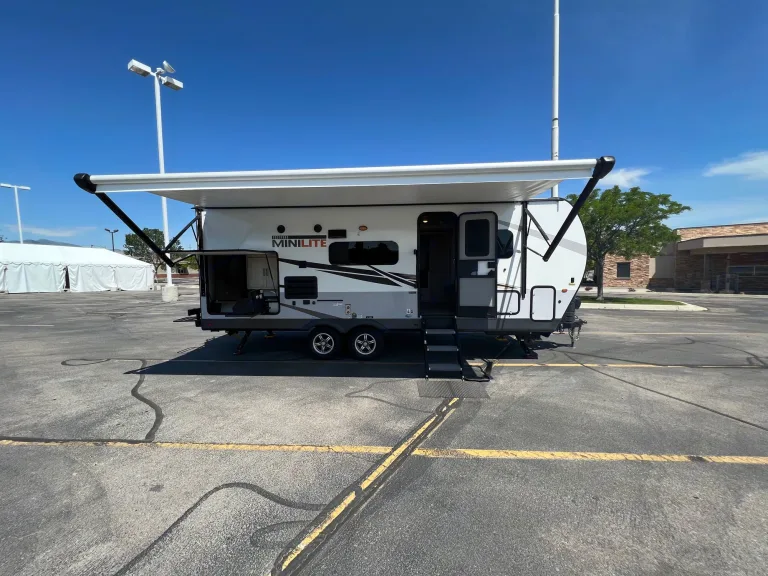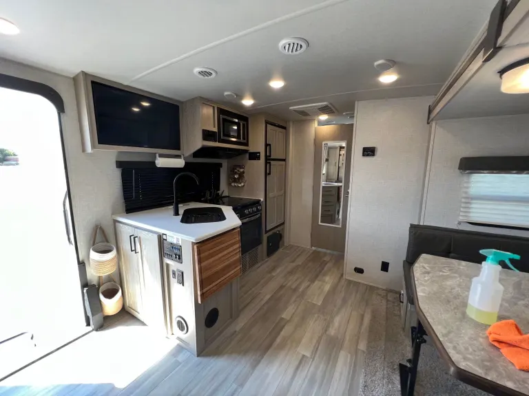 Our Rockwood MiniLite maximizes space and storage without being too heavy or long. One of our favorite features is the outdoor kitchen. The outdoor kitchen features a mini fridge, stove top, faucet/sink, plus an additional propane line for additional grill. The tv shown mounted inside the trailer can also be moved outside and mounted on the outside of the trailer, plus we have exterior speakers.We have a full kitchen inside the trailer along with a queen murphy bed featuring a heated matress, a U shape dining area that converts into bed, a large bathroom with a shower, and a lot of extra space to take your belongings.