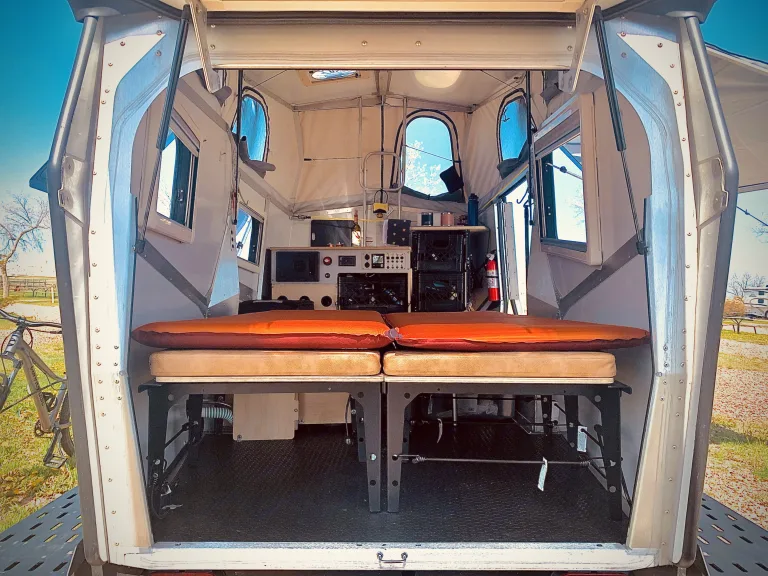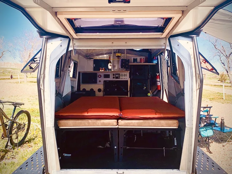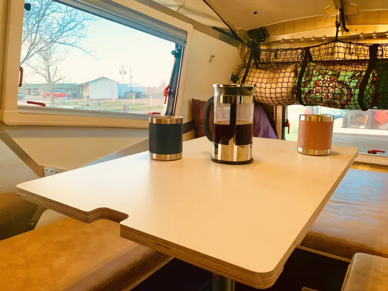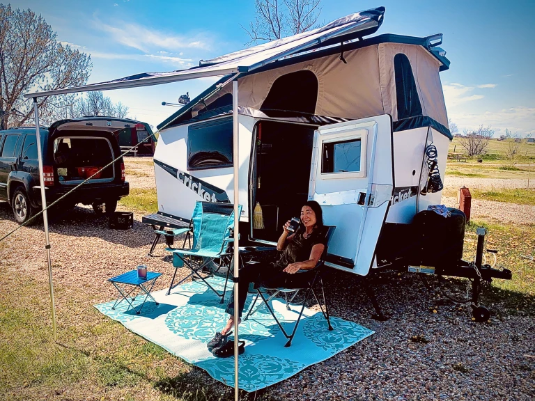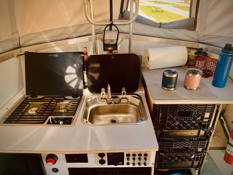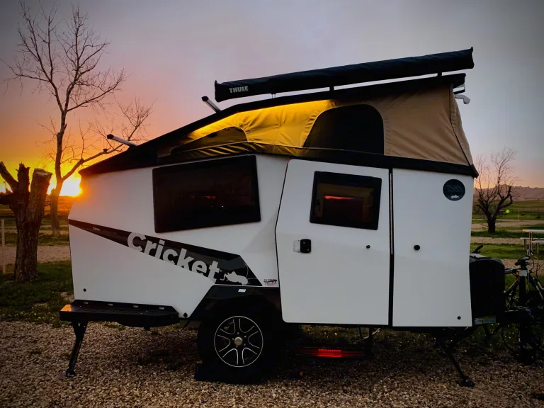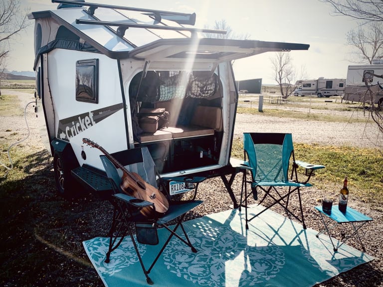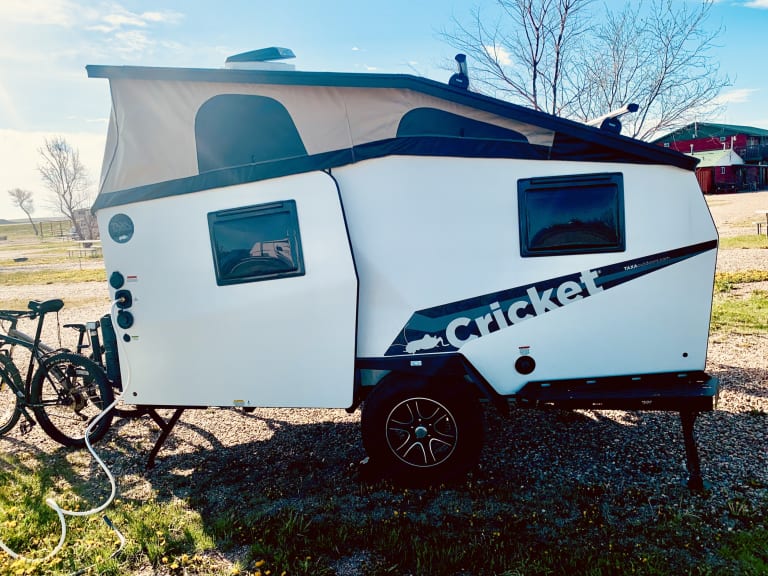 Lightweight and rugged, our Taxa Cricket is designed for an optimal camping experience! With sleeping room for two adults and two children, Taxa's Nasa-inspired design features integrated plumbing and electrical systems, propane heater, gas stove, sink (with hot water!) and a fully equipped kitchen. It's a perfect choice for on or off-grid camping.The canvas tent pops up and down with ease affording superior cross-ventilation and natural light for that 'bring the outside in' experience. The large exterior awning gives you a shaded 'front porch' area to hang out under.Park it at a tent site or head off-grid! Two powerful batteries allow you to run the lights, ceiling fan, water pump, heater/hot water and charge your devices without being plugged in for a few days. The Cricket's rugged construction is designed to handle your off-the-beaten-path adventure.We include a complete, high-quality kitchen set with the rental. Everything you need and maybe a few things you don't! (Detailed below). We also offer an array of accessories to augment your trip such as camp chairs, sleeping pads and even a stand-up paddle board! (Extra fees apply).The unique kids berths are suspended from the Cricket's ceiling and can fold up out of the way when not in use. Max weight is 130 lbs. 5'2" long.There's a hot and cold outdoor shower for you, your pooch and your kids. Extra options include a porta-potty kit and privacy tent.The Cricket weighs 1800 lbs dry, making it an easy tow for most vehicles. It takes a 2" ball hitch and a 7-pin round trailer connector. We have an adjustable hitch, a brake controller and a 4-7 pin adapter (if needed) included in rental. Feel free to reach out with questions in regards to your tow vehicle.Whether you're a solo traveler, a couple getting away from it all, or a family looking for that next great outdoor adventure, let our lucky Cricket be your ticket!We look forward to sharing it and meeting you soon!What's includedOur Cricket comes stocked with the following:Either, IceCo Single-Zone 43 Qt. Refrigerator/Freezer: (For electric hook-up sites)