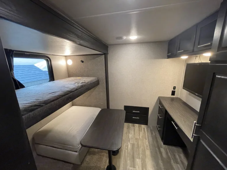 Travel in comfort no matter where you go with this luxury apartment on wheels! This Jayco North Point 377Rlbh sleeps 4 people comfortably and gives you all the comforts of home - including a washer and dryer!Still have to work while on the road? Not a problem with this floor plan! You can work from any destination with this fifth wheel thanks to the middle bonus room that offers a desk with TV above, upgraded seating that transforms to a bed, removable table, a flip-up bunk and a closet. This multi-use room works for just about anything including an extra living area and bunkhouse.Want to try boondocking? Not a problem with this rig. It has a 70 gallon fresh water tank, two gray tanks totaling 87 gallons, and a 50 gallon black tank. No generator? No problem - a portable inverter generator can be provided with your rental.No matter what season you want to explore, this rig can handle all seasons. Winter camping in -9 degree weather and 20" of snow? Been there, done that with no issues thanks to the furnace and electric fireplace that actually puts out heat. Summer camping in 100 degree weather? Been there, done that with no issues as well! The 2 AC units cools the entire rig to keep you comfortable. Plus the 2 large awnings lets you enjoy the outside while being in the shade.If you're looking to rough it - unfortunately this isn't the rig for you. But if you're looking to explore this great country of ours without sacrificing the comforts you're used to - this is the rig to book!