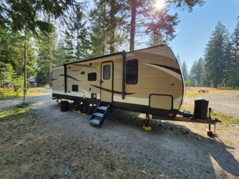 This hideout is ready for your next adventure! Very spacious once the large slide is out and can fit your whole family and fur babies. Plenty of storage space for all your activities and even includes a bike rack. Large awning, great AC unit that cools off the trailer very quickly with these hot summer days. What's includedCamping chairs provided upon request. Other things to notePets welcome!