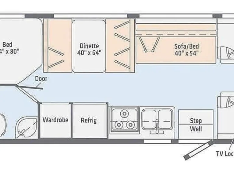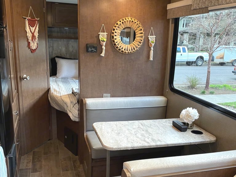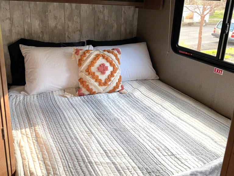 This is a super cute rig that is in excellent condition. There are memory foam toppers on the 2 full xl beds(54"x80" and 54"x95") that make for a cozy night's sleep. The original RV specs claim that 8 people can comfortably sleep in this RV, but I really don't see how that is possible. I would think that it would fit 4 adults max.What's includedThere are blankets, linens, and pillows for the beds. The kitchen has plates, bowls, silverware, knives, cooking utensils, toaster over, microwave, cutting boards, wine glasses, water glasses, pans and pots. There are also towels and washcloths, 4 adult camping chairs, 2 child-size camping chairs, 1 small outdoor side table, 1 medium outdoor dining table, outdoor rug, & board games.