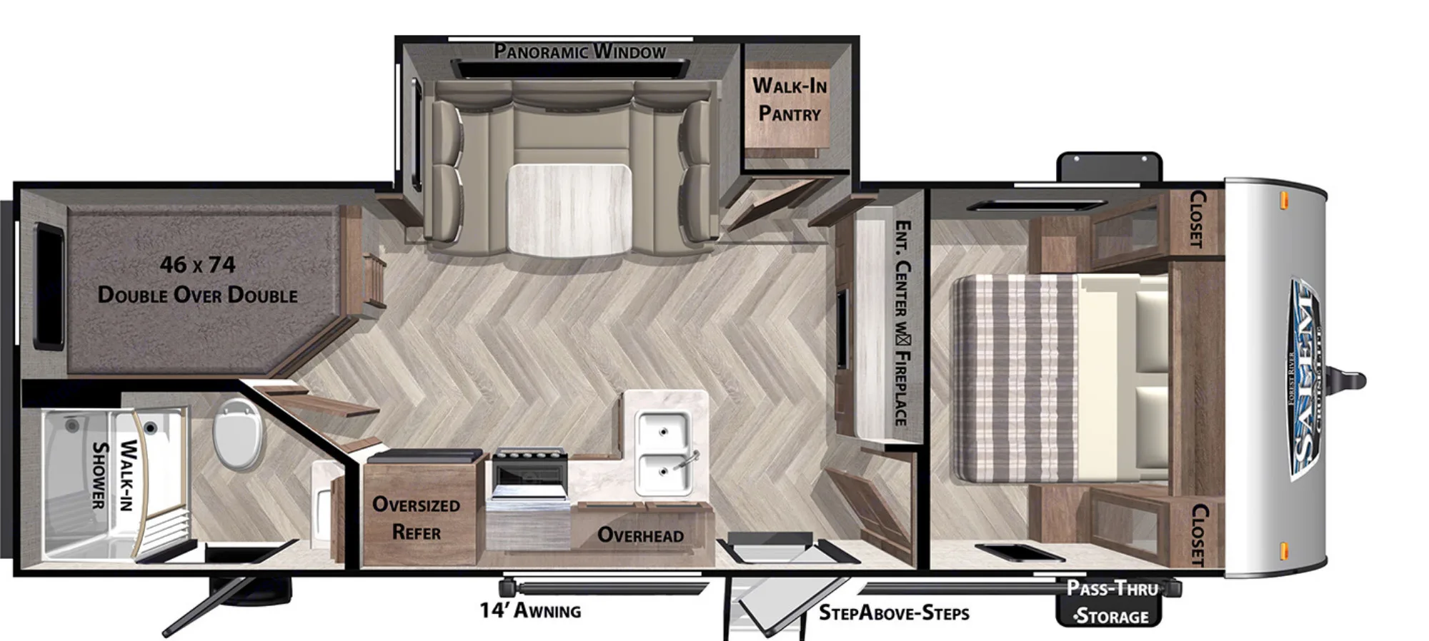 Inside a modern RV rental: mounted TV, light gray textured walls & ceiling, and a comfy patterned bed.. Forest River Other 2022
