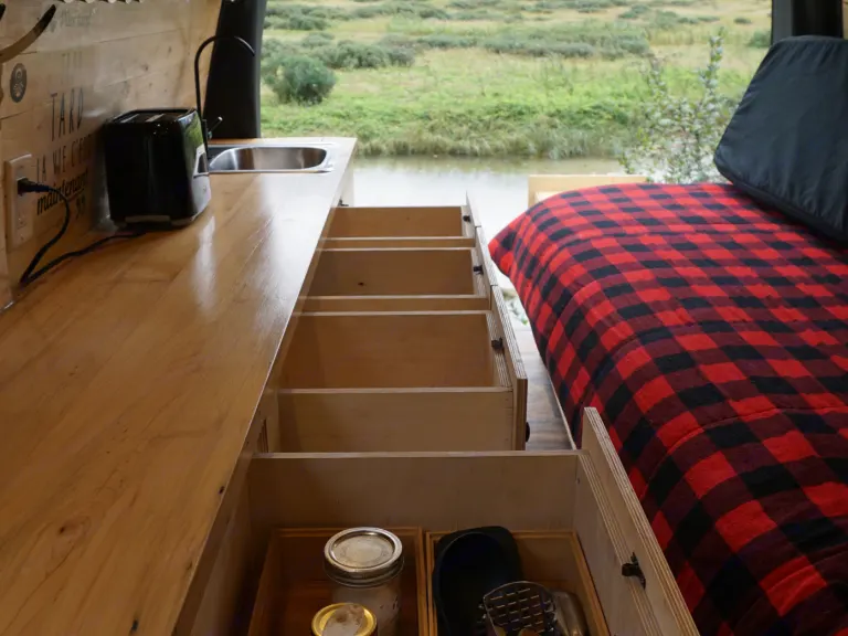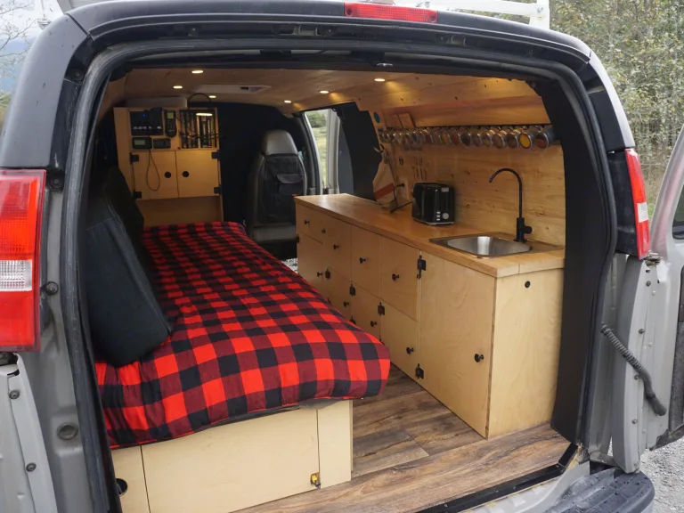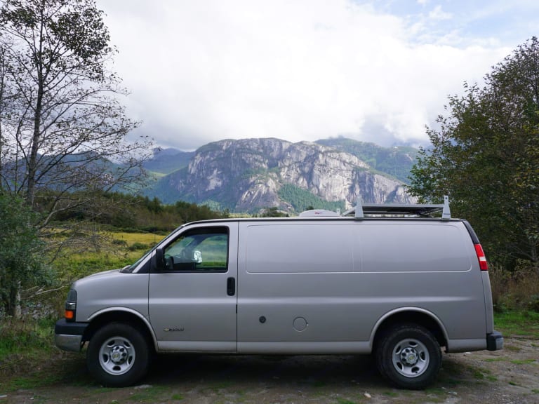 Experience what it feels like to live in a fully-equipped cozy cabin-like van.Valkyrie is 2005 Chevy Express 3500 in top condition (I dare you to find a speck of rust on this body!) and up-to-date maintenance and inspection. It's professionally converted with custom-designed and solid cabinets and storage units, spray foam insulation for comfort, and a fully autonomous electrical system running on solar power, alternator, and 110V plug-in socket. So whether you stay at one spot for a while or drive around, the 100ah Lithium Battery will support all your power needs (I've never seen it go below 65% charge so far).Feel the power! The electrical amenities include an overhead 10-speed Maxxair Fan (air in/out with pop-out window in the back for the breeze), a Dometic 45L fridge with plenty of space for your groceries and drinks, a toaster, 2 LED lights tracks for over the bed & counter, RGB LED to set any mood you like, an inverter for charging your computer or any 110V appliances, 2 USB ports for your phones/tablets, and an electrical water pump for running water.Sleep well & eat well! Valkyrie is equipped with an easy to setup double bed and a 5-inch high-density foam mattress for a comfy night's sleep. Enjoy cooking food with a rack of 18 different spices, ample counter space and a pull-out drawer under the bed to cook outside with a 2 burners propane stove. Although the car isn't equipped with a heater, it is well insulated and when it gets a bit chilly in the morning, just start the car and blast the heat - it will warm the place up in just 5 minutes.Enough storage for your clothes and gear. With 3 baskets over the fridge and coat hangers for your clothes, 2 free compartments in the pull-out drawer and another one under the bed, back door gear storage units, as well as lots of kitchen & food storage in the cabinets, you'll have enough space to store everything you need for your trip. Valkyrie even features a mini-bar for your bottles on the side door!What's included- Fresh sheets and linen