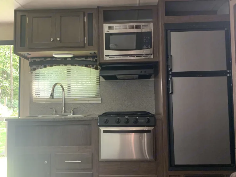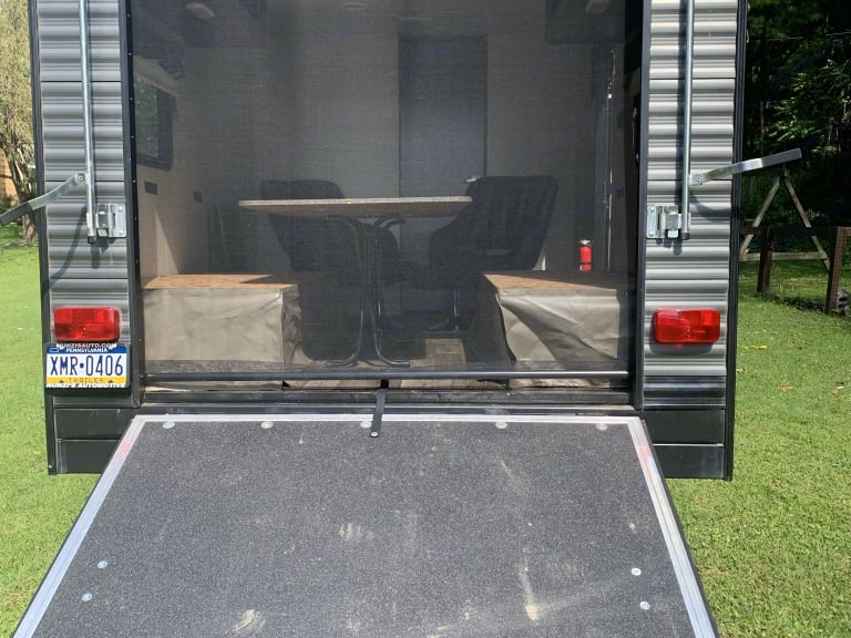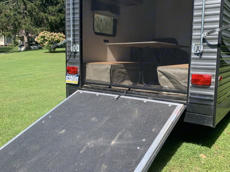 We have 33 ft. Heartland Prowler toy hauler. Sleeps 4 comfortably, but you could get 2 more bunks on the fold outs in the garage area. Equipped with AC and heat, a 32" TV for you to hook up your external drive or phone/ tablet to, and all your kitchen basics. We have also equipped it with many necessities to load/ unload your toy. We have a set of jack stands to put under the rear deck and 6 ft aluminum ramp to make the job easier. We keep tie downs and ratchet straps in there also. Also onboard are all your water hookup and sewage drains. Wheel chocks and support bases are also in there. When your motorcycle or side by side are board this will be a fairly heavy setup. Please make sure your truck is equipped to handle comfortably. Max cargo carrying weight is 2720 lbs.What's includedAs stated, lots of extras to make loading and unloading as easy as possible. Jack stands, 6ft aluminum ramp, ratchet straps, tie downs, etc. 4 camping chairs are usually kept in there and some linens. There are the kitchen basics also.RecommendationsMotorcycle rallies, poker runs or just anywhere you'd like to have your side by side or bike with you. Or even just a place to throw 4 or 5 bicycles and go.Other things to notePlease, if you have never loaded a motorcycle or side by side in a toy hauler , watch a video or 2 to get the basics. Take your time and be extra careful. And if your going to mess up, make sure someone is making a video so we can put you on Youtube.