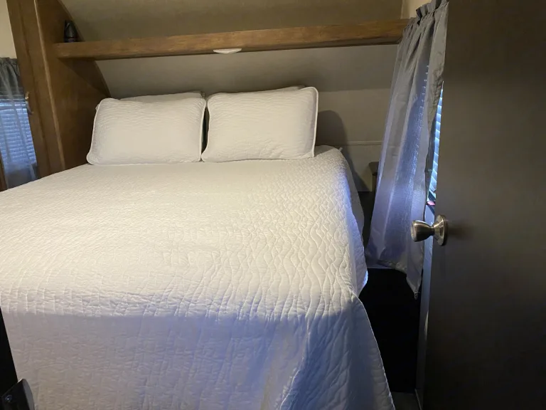 It comes with a queen size mattress in the bed room (it is a regular queen to give tall people leg room) with lots of closet space to hang clothes. You can turn the dinning room table into a full sized bed and the couch turns into a mattress we also have a queen size blow up mattress. Dishes and utensils are included. The bathroom has towels and wash rags. We also have blankets and linens, for the bed and futon and air mattress whatever ya'll would like to use. If you have any questions or concerns or need anything just message us and we will help you out the best we can.What's included5 camping chairs