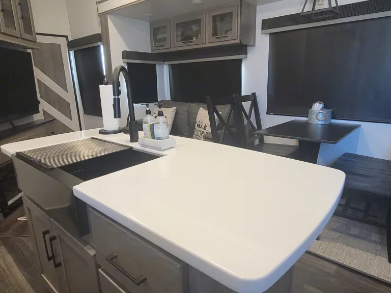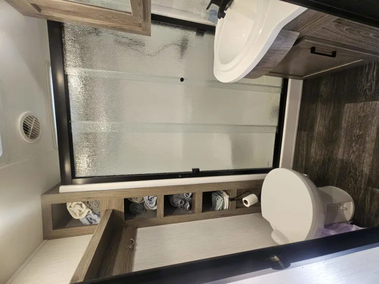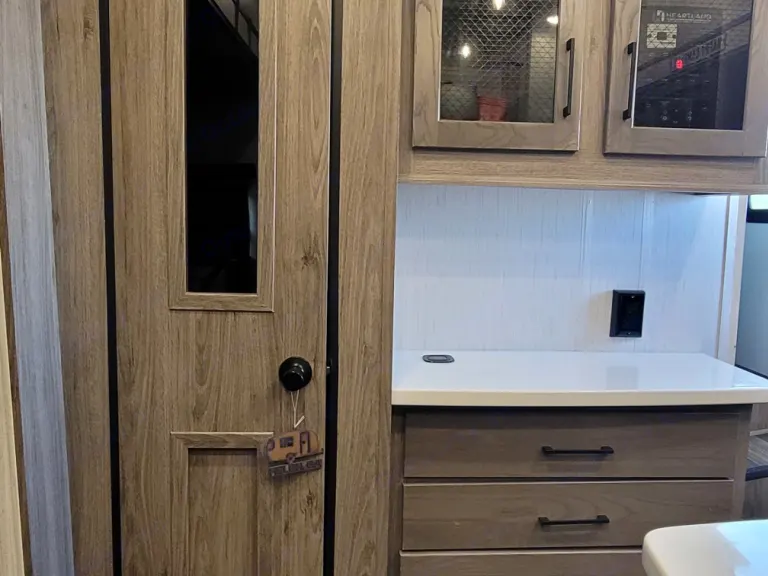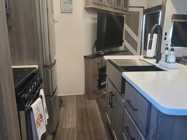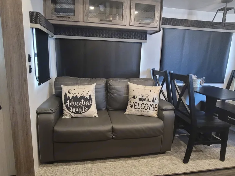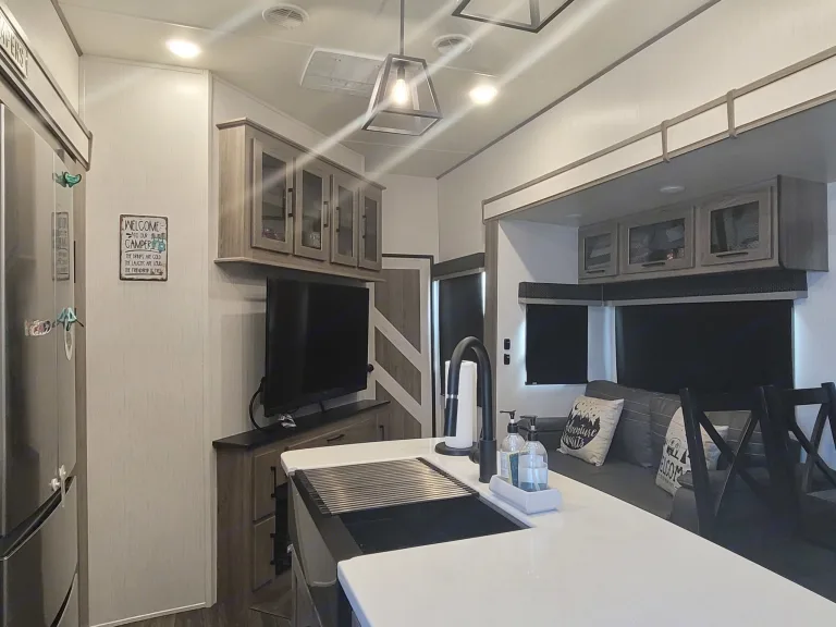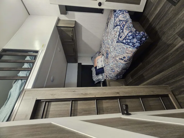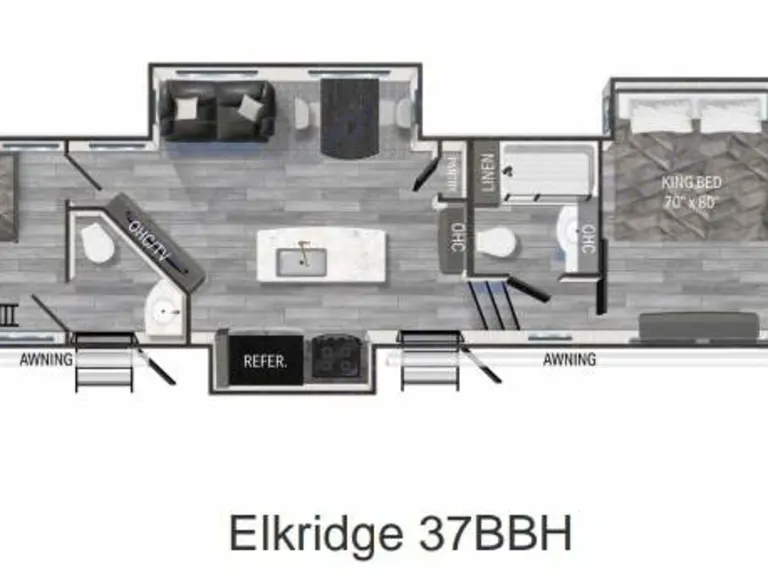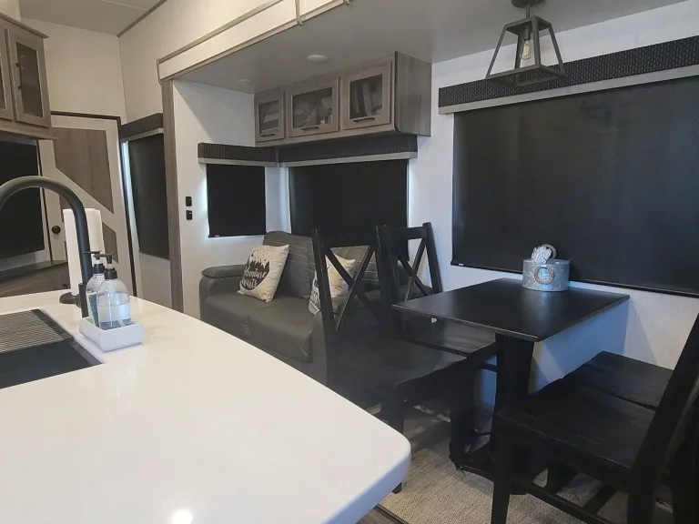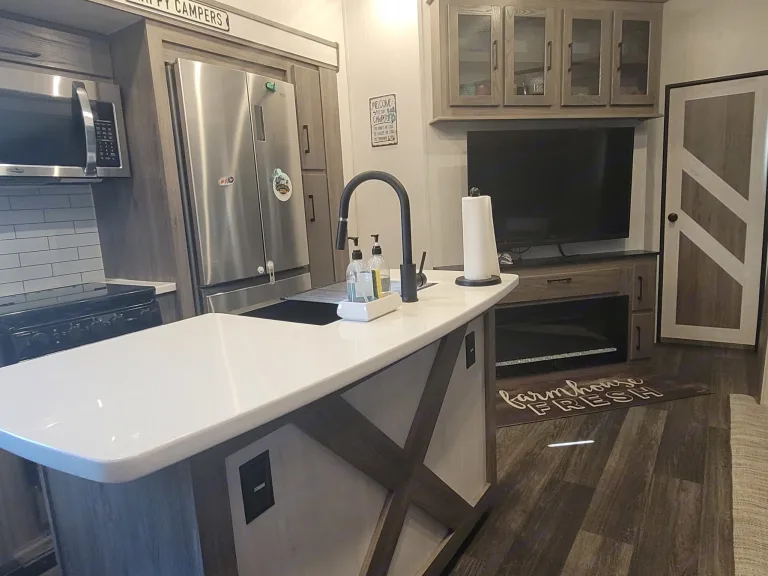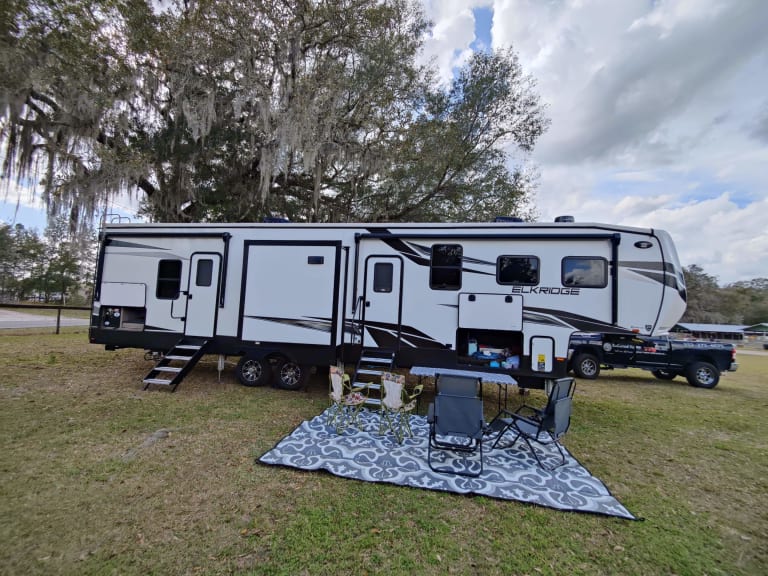 Available FOR Delivery AND Pick UP BY US Only....Elkridge is a new 2022 5th wheel featuring a farmhouse feel with 2 bedrooms and a bunk bed in the second room. This 5th wheel has 1.5 bathrooms, a king-sized bed, a full-sized bed, a farmhouse sink, a stove, a microwave, and a fireplace. There is tons of storage space and is fully equipped with all your camping needs. This 5th wheel also has a great outdoor kitchen and 2 awnings to keep you in the shade when outside on those hot summer days. WE DO NOT Offer Boondocking Must Have Full Hook UP Sites!!!! Sites must be at least 42 feet long, but 45 is preferred.What's included-Fresh linens, pillows, towels, extra blankets