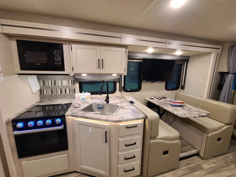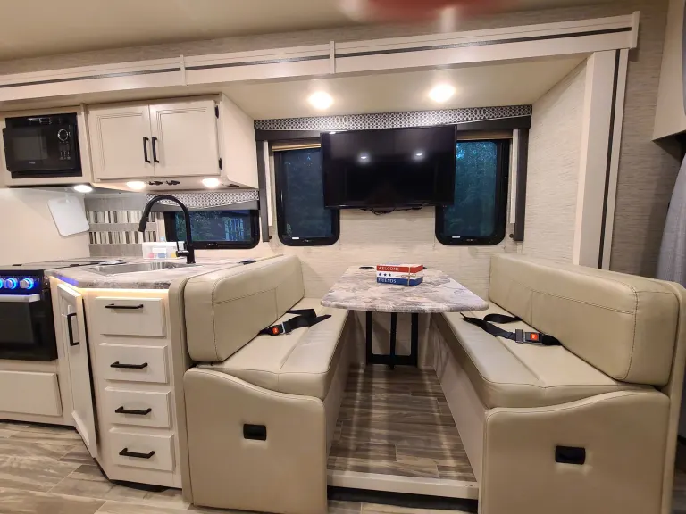 Thunder Home is a brand new 2021 Thor Motor Coach A.C.E. and features all the bells and whistles of home on the road. With over 112 cu. sf. of available storage, not only will you have enough room to take what you want but have space for all your souvenirs along your voyage.Inside you will find ivory coast cabinetry throughout, leatherette dinette and sofa area, along with a collection of beds sleeping up to eight along with the king sized master suite. This modern and sleek RV features three LED T.V.'s: two inside and one outside with accompanying sound bar. Thunder Home is jam-packed with high-end components for your pleasure: furnace/water heater system, gas Cummins 60 amp generator, duel air conditioning, microwave, LED accent "night lights" for the kids, 3-burner glass propane cooktop/oven, and co-captain workstation for those meetings on the go to mention a few.This 7.3L gas motor coach is easy to drive with heated integrated side-view and back up cameras, cruise control, and added steering stabilizer.Awning is reserved for owners use only, due to high risk of damage. Portable canopy will be provide at owners expense.Our RV will enhance not only your vacation but bring your family closer, just like she has ours. It is time to plan your getaway and enjoy life like we all should be!What's includedFresh linens and comforter for the Master Suite, one 2x5 folding table w/ table cloth, two gravity chairs, basic cutlery and cookware, DVD player, games, toilet paper (RV specific), basic hotel toiletries, towels, bedroom hangers.Delivery and pick-up within 75-100 mile radius, upon request. RecommendationsOdetah RV Resort in Bozrah, CT. Family friendly with pools, mini-golf, playgrounds store, lakes to fish and kayak in, fun day and night itinerary, plus an ice cream shop. This location had full hook-ups and plenty of room for another vehicle or two.Hersheypark Camping Resort in Hummelstown, PA. Family friendly with 3 pools, arcade, stores, playgrounds, only 10 minute drive from Hershey Park offers full hook-ups and space for another vehicle. The store will give you discounted tickets to the park too!We have driven from Connecticut to Nevada and back. Thunder home does well while boondocking and driving long hours.Other things to note*Dogs welcome! Size is determined at that time by owner.
