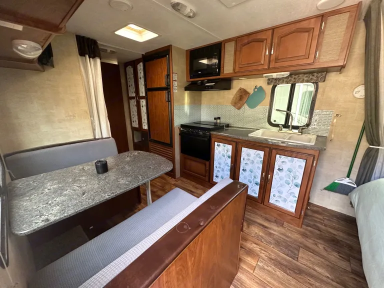 Our trailer is your passport to all the Sunshine Coast has to offer! Small enough to get into more remote campsites, but big enough to sleep 5 and offer the luxuries of glamping.This 2013 Keystone Passport Express Super Lite is easy to tow, fully equipped, has loads of room for storage and is perfect for a cozy getaway.Bedding includes a comfy queen-sized bed, corner bunk-beds and a fold down dinette single. Please note that linens are not provided so plan to bring your own. Rear corner bathroom includes a separate shower tub.Gas furnace, A/C, gas/electric fridge, 12’ power awning, indoor/outdoor speakers, TV & CD player, microwave, gas stove/range and power jack for easy setup & hitching.What's includedDishes, cookware, cutlery, dish & hand soap.