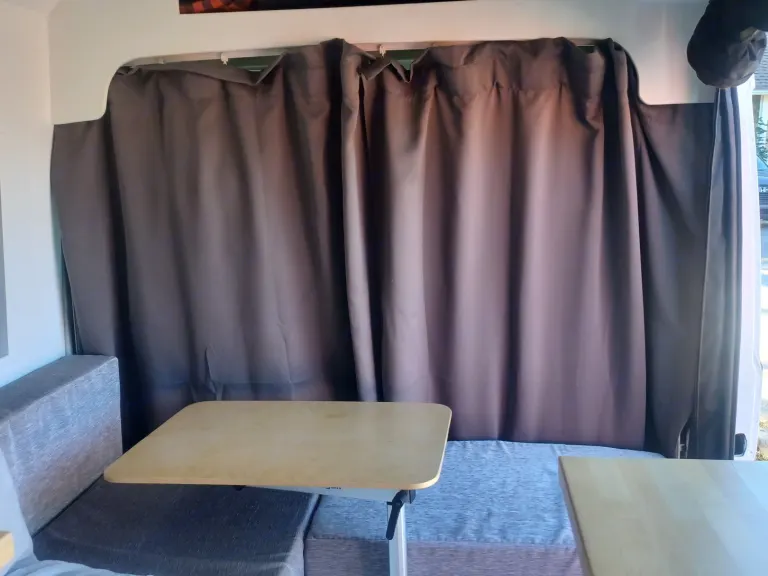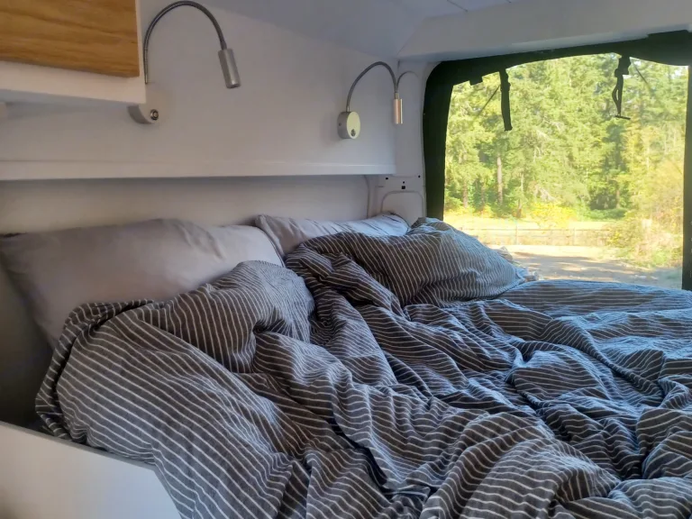 Book Ramantha, our beloved hand-built camper van, for the most comfortable and easy camping experience around. Ramantha sleeps two adults on a comfy queen mattress that is permanently suspended above her ample cargo hold—no rearranging the whole van to make your bed at night.