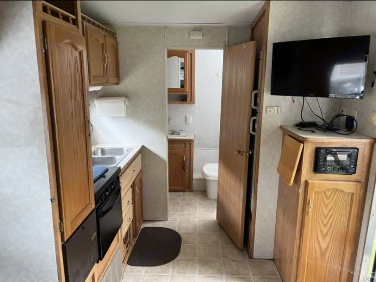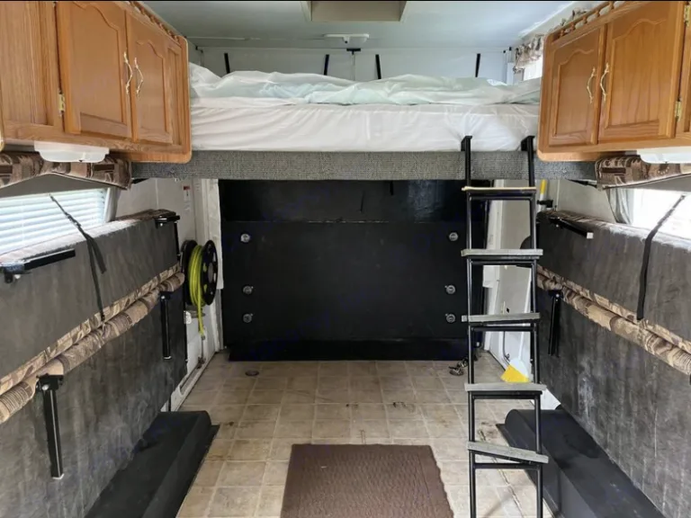 Oldie but goodie toy hauler, has big cargo area with lots of tie down points, has queen bed up top and benches can be 2 twin beds or make into a kingWhat's includedFresh linens if no pets, cooking utensils, pots ,pans,towels, wash cloths and KeurigRecommendationsPlease check out our add-ons for more camping activities. Less you have to pack if we can already have it for you. Other things to noteNo smoking or vaping inside of camper