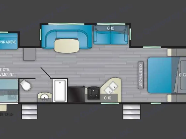 Queen sofa bed, dinette bed and bunk beds separated by a curtain.Interior: Equipped with sink, stove and oven, microwave, fridge, ac and heater. Living room has a TV, DVD player and radio.Exterior: 2 power slide outs, exterior speakers for more fun. Has an outside kitchen ( counter top with extra cutting pull out board, bbq grill, sink, fridge, cupboard. Exterior shower, power awning with led lights.Also included: stabilizing Jack's, ans sway bar.Comes with 3 toilet paper rolls, 1 paper towel roll, pots and pans, utensils, paper plates, plastic cups. Cooking utensils, cutting boards, cheese grater, dish towels, oven Mits not for outside use. Hand soap and dish soap.