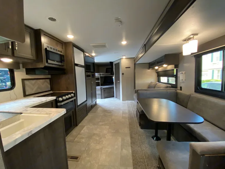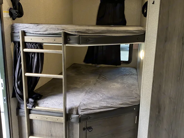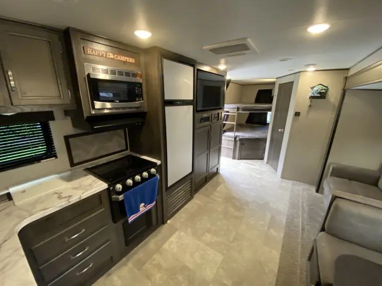 Our bunk house style travel trailer is just the right size for your family to camp in style! Great camping trailer!! Outdoor kitchen with fridge, cook top and sink for quick and easy cleanup. Upgraded mattress for a great nights sleep! This trailer has 1 Queen bed with upgraded mattress in the bedroom, 1 set of bunk beds, pull out couch and U shaped dinette that lowers to accommodate sleeping for up to 10 people.Inside you'll find comforts including A/C, Heating, 32” TV with Hdmi Connection, and AM/FM/Bluetooth Multimedia Audio System.Outside you'll find a shower great for rinsing off sand from the beach, 16’ Awning with speakers and LED Lighting,Generator is available for an additional fee so if you are not hooked into electricity and do not have one it's a great add on.