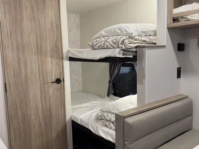 Sleeps 5: Queen bed, 2 bunks, plus convertible dinette.
