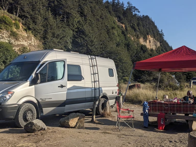 Meet Silverback; our professionally built 170 LB Mercedes-Benz Sprinter by Sportsmobile. The van is hooked up for all season adventure and comes equipped with large all-terrain tires, dual ceiling fans, espar diesel heater, kitchen/food prep area (w/sink, granite countertops, microwave, fridge) queen-sized fold-out bed, dual rear passenger seats, bench seat ( that converts to a mini bed), private toilet w/sink and shower , 16 gallon fresh water tank, apple "carplay" stereo, .subwoofer, solar panels, and tons of storage space for your adventure. Has capacity to seat 7 adults & can sleep sleep 4The 3500 diesel-powered Sprinter with dual tires on the rear axle provides greater traction and stability on winding roads, mountains, and uneven terrain. Van is fully winterized and comes with chains just in case so you can feel safe taking it to the mountains on your next Tahoe ski trip or to the California coast and fall asleep listening to the soothing sound of waves crashing outside.Pickup