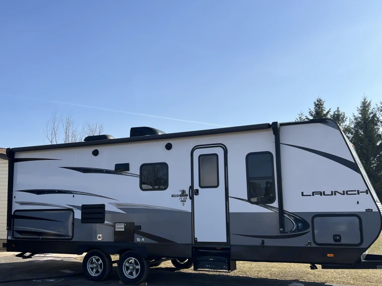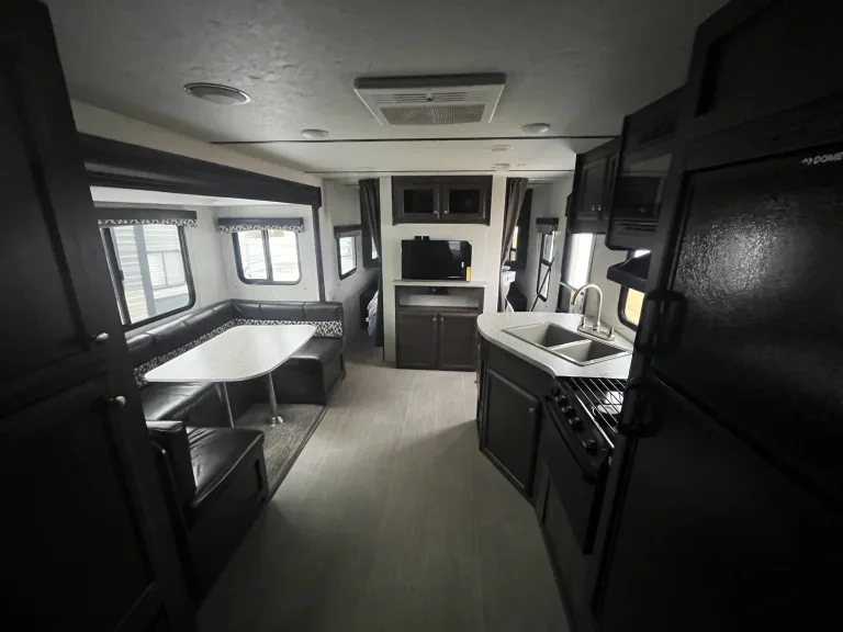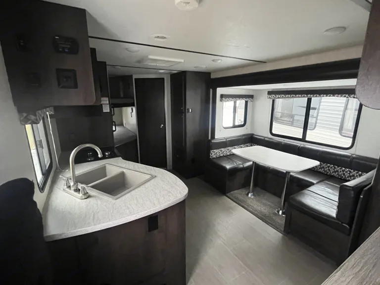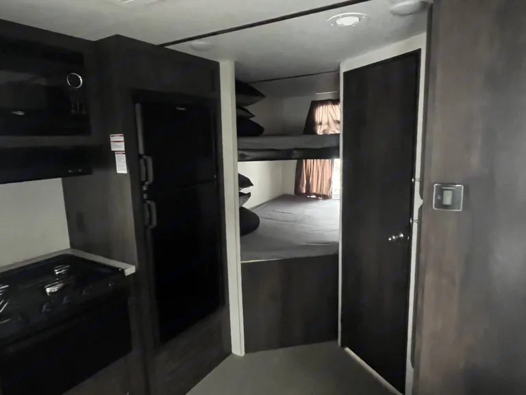 Comfortably sleep up to 6 individuals, making it perfect for families and friends who want to create unforgettable memories. This Unit Has a private bedroom with a queen-sized bed and a double bunk bed, along with a pull-out couch bed. The table collapses into a bed. Additionally, it has a fully equipped kitchen that includes a stove with an oven and three burners, a microwave, and a refrigerator. For those who prefer to cook outdoors, there is a two-burner stove, mini-fridge, and sink in the outside kitchen.Has a radio that can be enjoyed both indoors and outdoors. The camper is equipped with a full-size awning that features LED lights and an outdoor shower for rinsing off after a day at the lake or on the trails. For optimal comfort, it has air conditioning and heating, and its propane tanks are full.