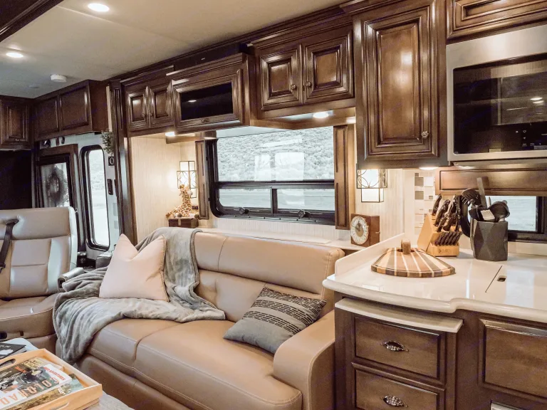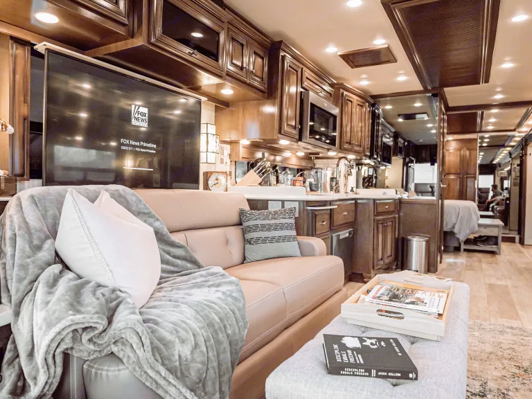This luxury RV has everything you need to ensure you're travelling in opulence, comfort and style, all while having the RV vacation of a lifetime! This floorplan boasts a king master bed, a full-size shower you can actually move around in, onboard washer and dryer, dual vanity in master bath, a second half bath, and is an entertainer's delight. In addition, there is in-floor heating, an exterior entertainment center, fridge & grill, 3 different AC units for conditioning various spaces, induction stovetop, dishwasher, microwave, full-size refrigerator and freezer, floor to ceiling pantry, storage galore, and anything else you'd expect from a luxury coach.Want to enjoy hot summer days glamping and boondocking on the lake...but have cool cold air inside the coach? Hercum (the coaches nickname) has you covered! With 3 different AC units you can individually condition 3 separate zones to your liking. At night, enjoy the cool lake air by opening the windows and enjoying the breeze.If you're bringing the kids or grandkids with you, close the sliding door to the private master suite and private master bath with dual vanities. Kids have access to the half bath without disturbing you, and more importantly, have their own TV with a Playstation 4 and DVD player.Speaking of entertainment, the coach has 4 TV's, 3 inside and 1 out, and all have FireStick streaming devices connected to them. Each include services such as Hulu, Netflix, Disney+, Prime Video, Etc. Worried about staying connected? Don't. The coach is able to pickup distant WiFi signals, boost them and the redistribute that signal throughout the coach. Even if you're in a location that doesn't have WiFi, so long as you have a cell signal you're covered. The WiFi antenna is equipped with it's own AT&T SIM card and can receive a dedicated signal which it uses to redistribute throughout the coach.Please feel free to review the pictures. They showcase the type of luxury you can expect.What's includedThe coach is outfitted with everything you need to begin your journey. Full sets of linens, pillows and the like, dishes, cookware, spices and oils for cooking, serving dishes, cutting boards, knives and utensils all live on the coach. Just bring your clothes, buy your groceries, and don't forget a nice bottle of wine or two and you're all set.If you have questions about specifics on what's included, or have a special request, please do not hesitate to reach out and ask.For an additional rental fee, I have a Ram 1500 Limited EcoDiesel for rent as a flat tow vehicle. This makes for the perfect running around vehicle when you get to your destination. Get groceries, go sightseeing, explore dirt roads and remote places, camp, or simply use the truck to go to a nice restaurant.RecommendationsThe coach is stationed in Traverse City but is able to travel just about anywhere. Lake Michigan, Torch Lake, Lake Charlevoix, Old Mission, Leelanau, Sleeping Bear Dunes, Petoskey, Harbor Springs, Mackinaw, the Upper Peninsula and Tahquamenon Falls are only a day away in this rig. Your imagination is your only limit. Well, that and the Canadian border.This unit is available for pickup in Traverse City or can be delivered just about anywhere in the state.I am open to festivals as destinations but require previous knowledge and detailed review of expectations prior to agreeing to a rental.Other things to noteI also have a Ram 1500 EcoDiesel Limited for use as a toad (tow behind vehicle) available for an additional cost; please inquire.For any motorcycle riders and off road adventure seekers, I have a custom built motorcycle rack that attaches to the coach and allows the toad to be towed behind the rack. The rack will accommodate two bikes and/or approximately 1,000 pounds. I personally use it for a BMW R1200GS Adventure and a KTM 350. In addition, the truck allows for additional towing space, should you need it.Pets are welcome as long as you pick up after them. Events and festivals are welcome, but please treat this like your home. I reserve the right to fully vet any and all potential renters. Driving experience is required if you wish to travel in the rig.