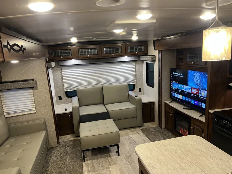 This here is out largest unit we have with 2 pull out couched and a queen bed. Bedroom has a washer and dryer combo in the large spacious closet