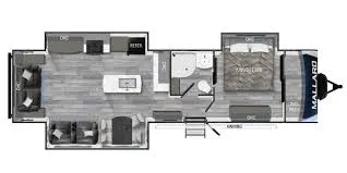 RV rental with a compact washer dryer unit neatly integrated into the bedroom closet, offering convenience and storage.. Heartland RVs Mallard 2019