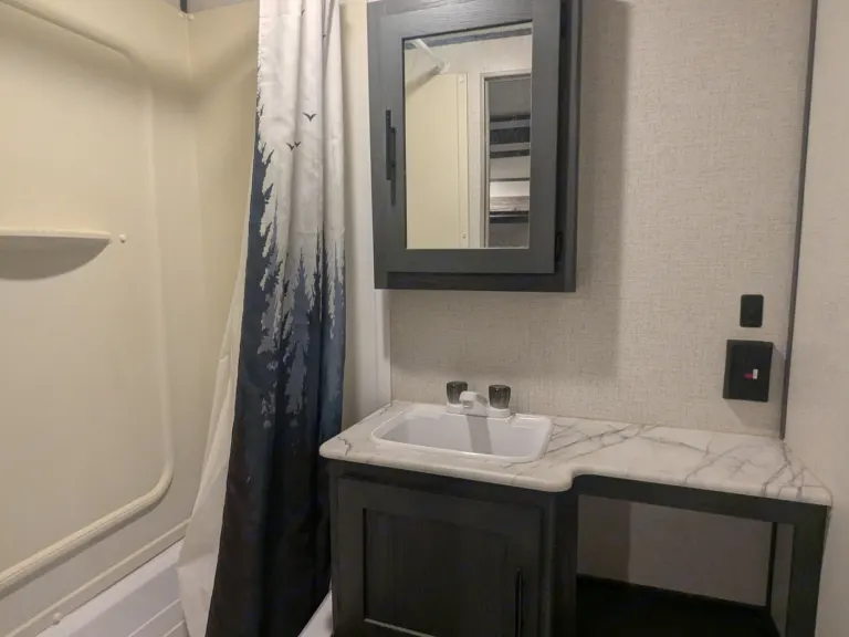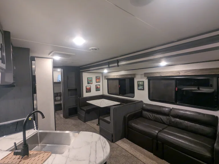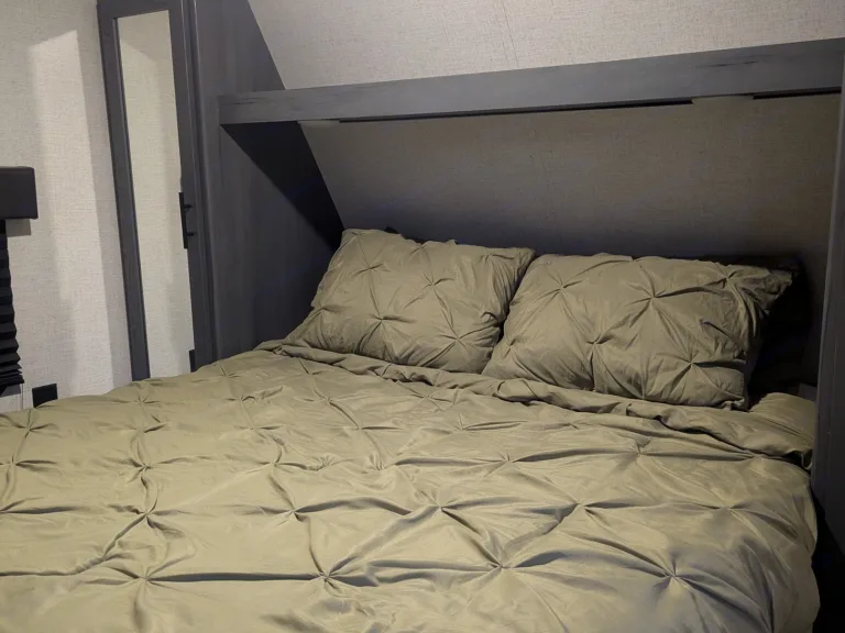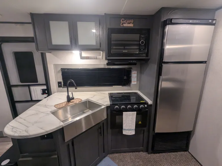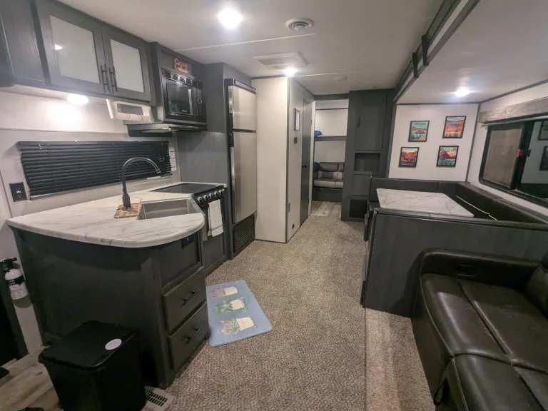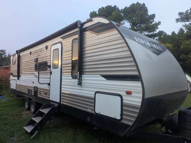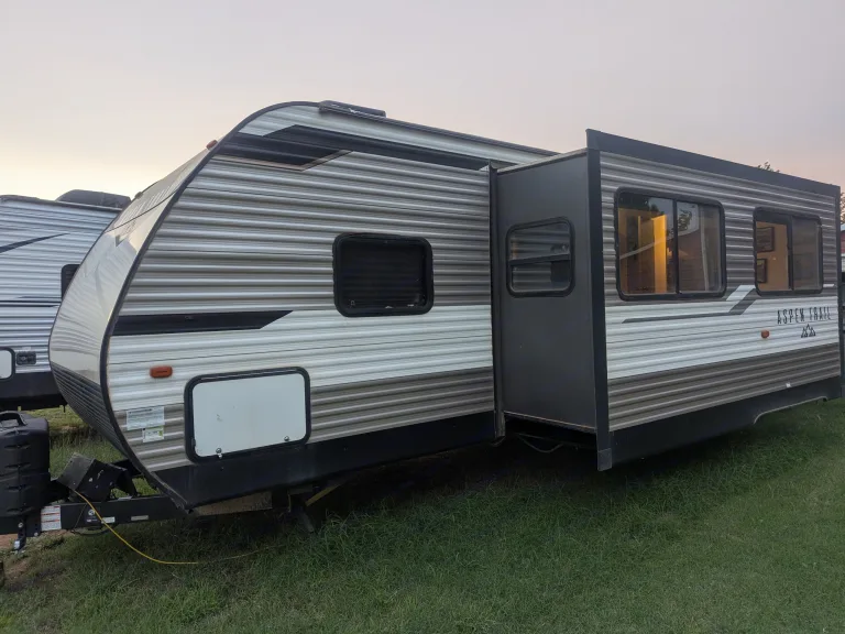 Looking to camp with privacy and plenty of space? Look no further! Inside you'll find a beautiful kitchen and living room with an extra large slide, plus two bedrooms! There is enough sleeping space for 8 (sleeps 5 adults comfortably). Delivery available.This 29' camper boasts dual AC units, a kitchen stocked with essentials, and an outdoor kitchen. Bedding and linens, are provided to make your stay a breeze!Full propane tanks, tank dumping, and cleaning are included so all you have to worry about is your vacation.Bedroom 1: Queen bedBedroom 2: 2 Full length twin beds, 2 short twinsKitchen/Dining: Dinette bed (full length twin), and Futon (short twin)Contact me to book now as spots are filling quickly!What's included• Kitchen basics